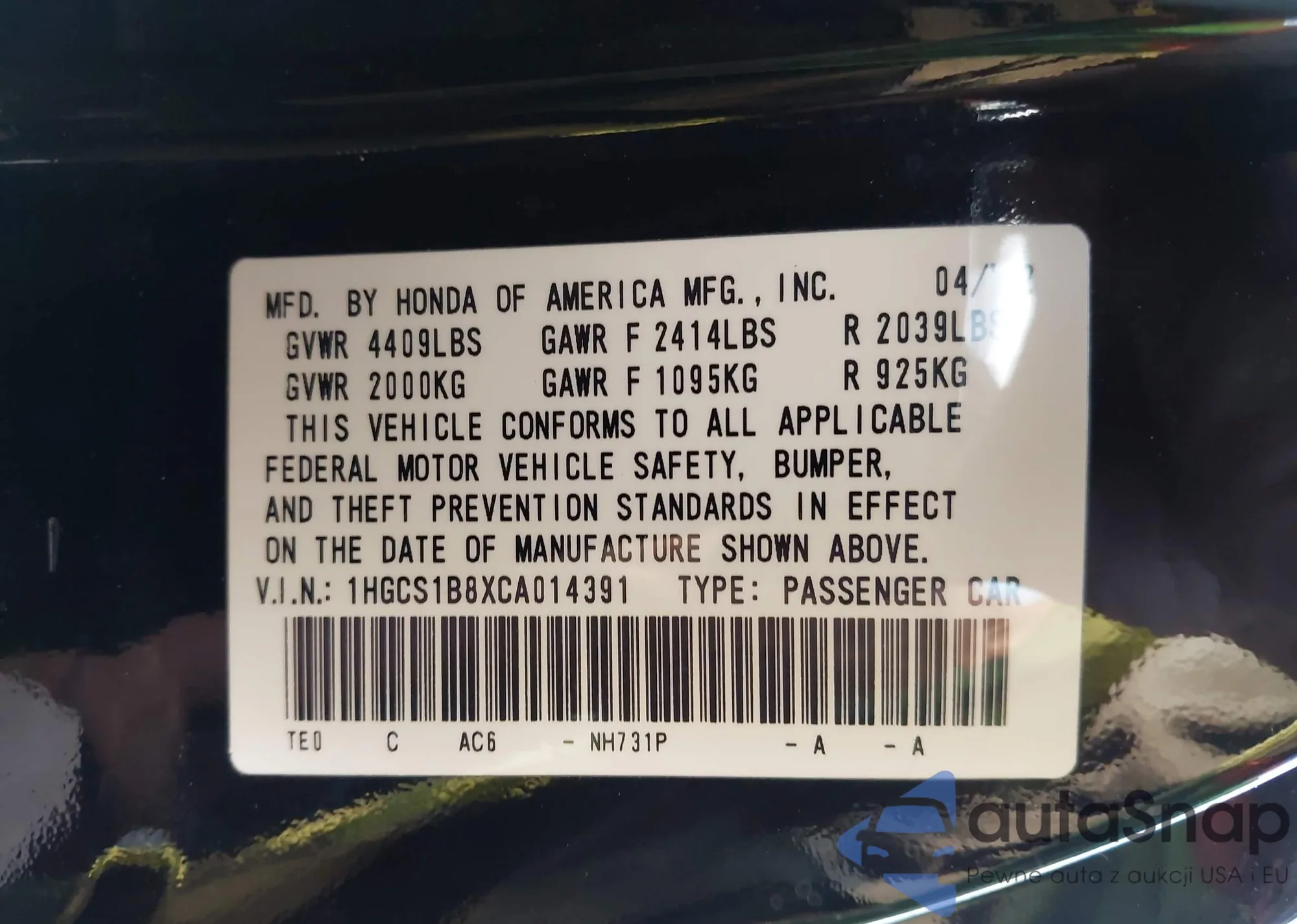LOT: 43725021 VIN: 1HGCS1B8XCA014391