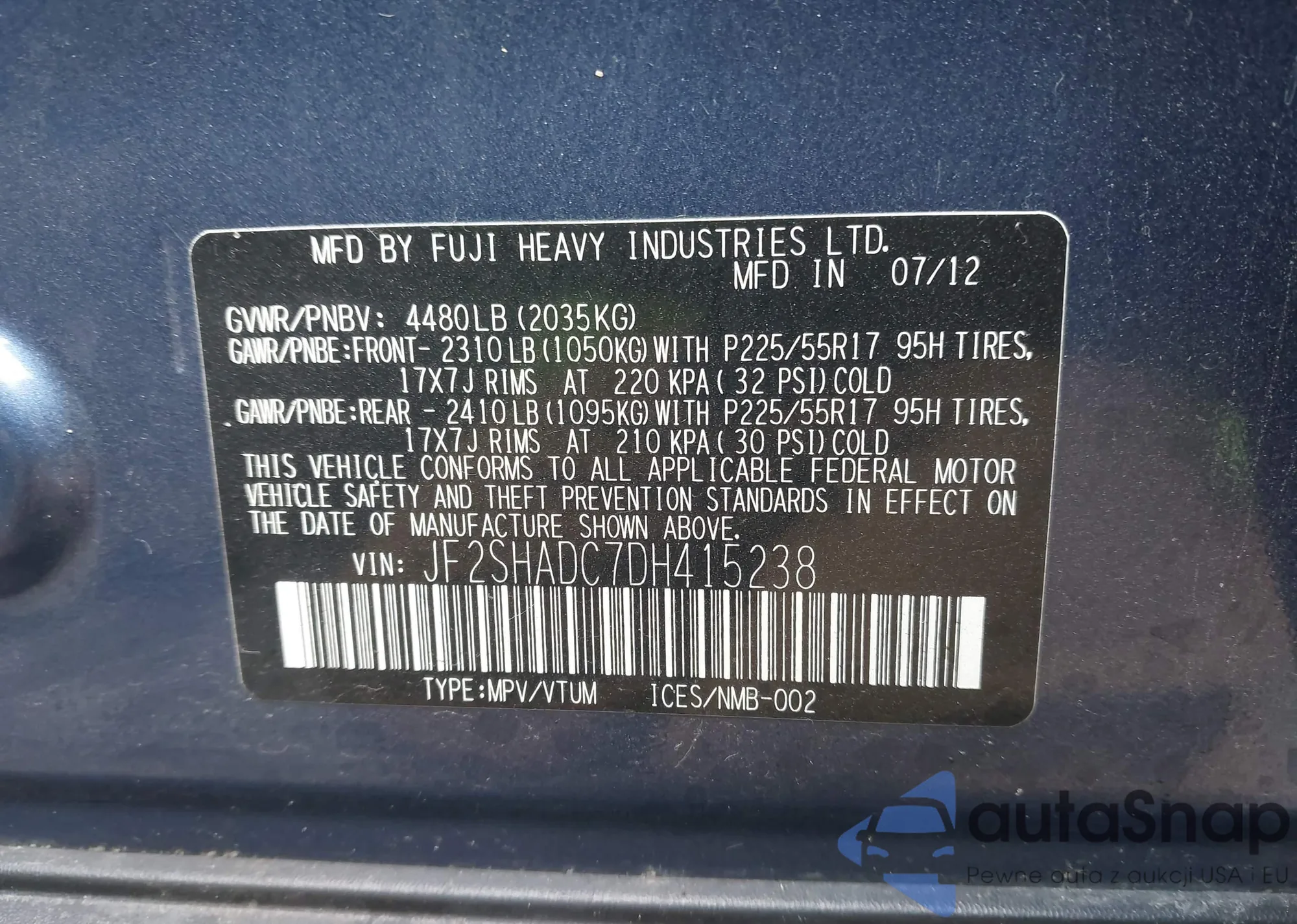 • VIN JF2SHADC7DH415238