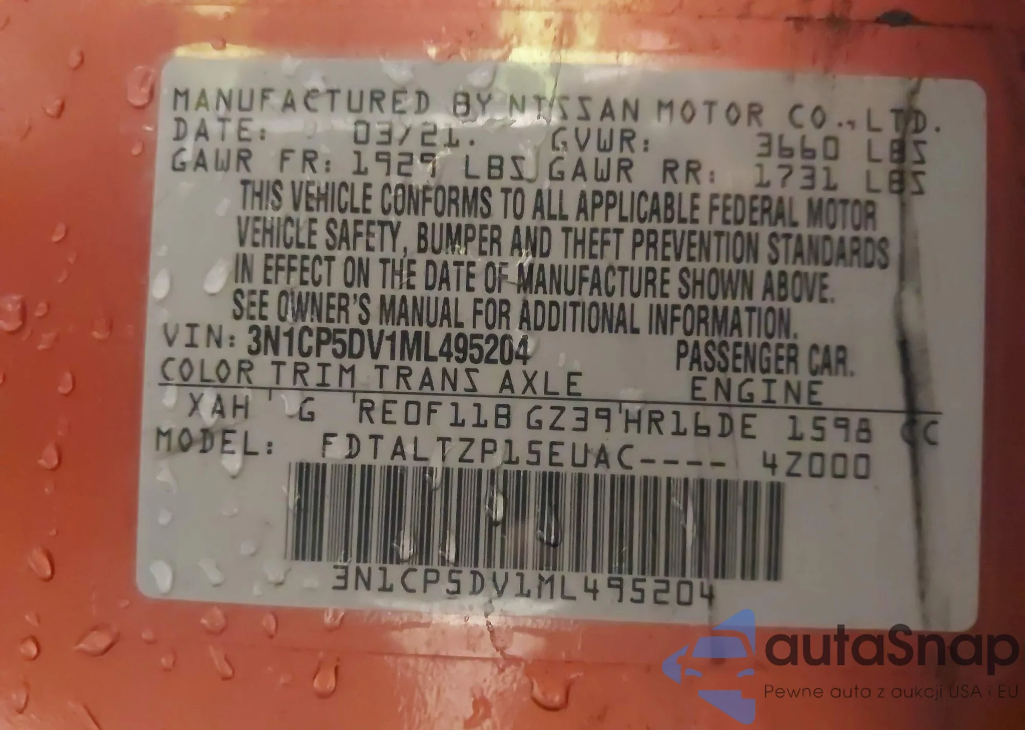 LOT: 44014570 VIN: 3N1CP5DV1ML495204
