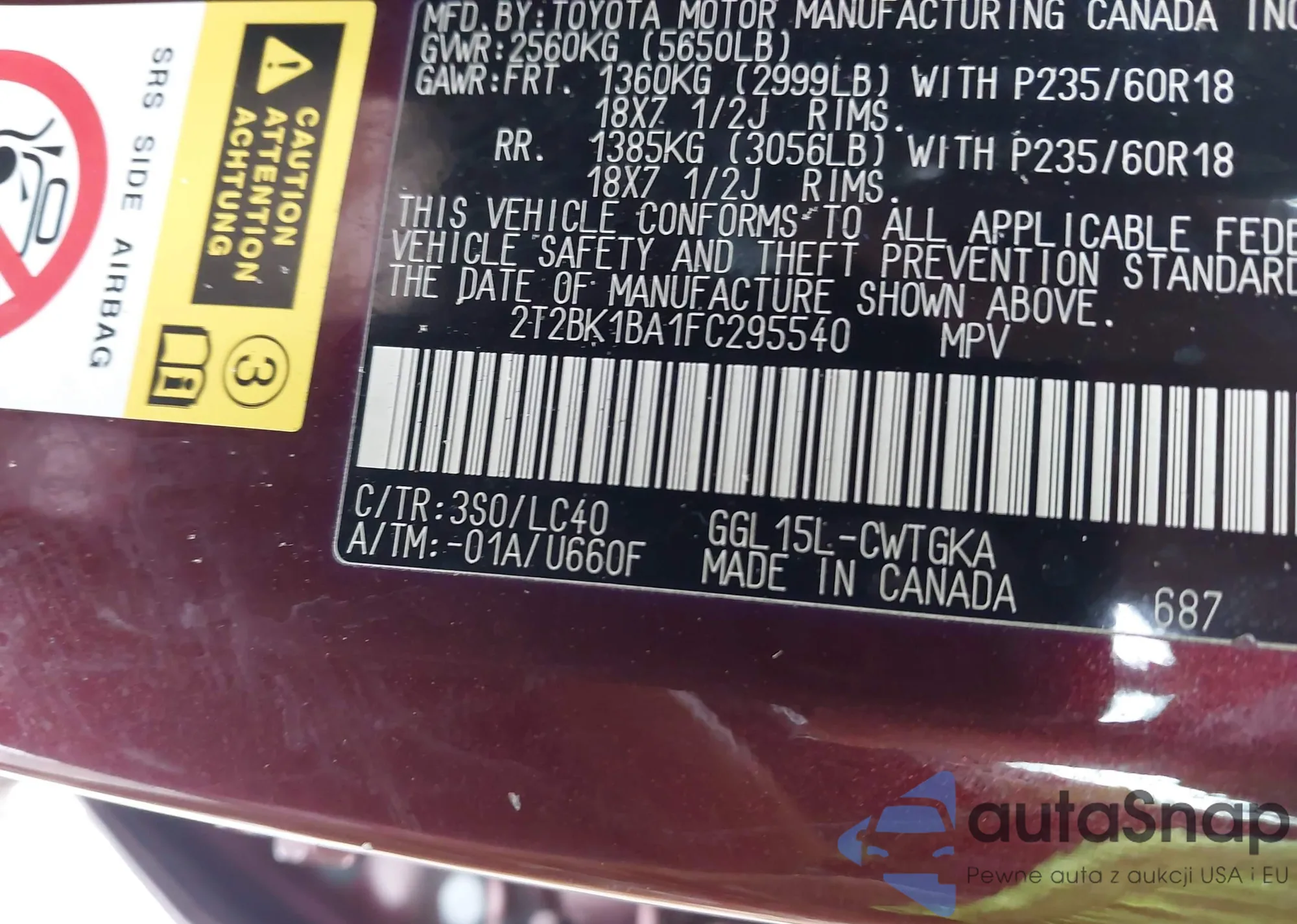 • VIN 2T2BK1BA1FC295540