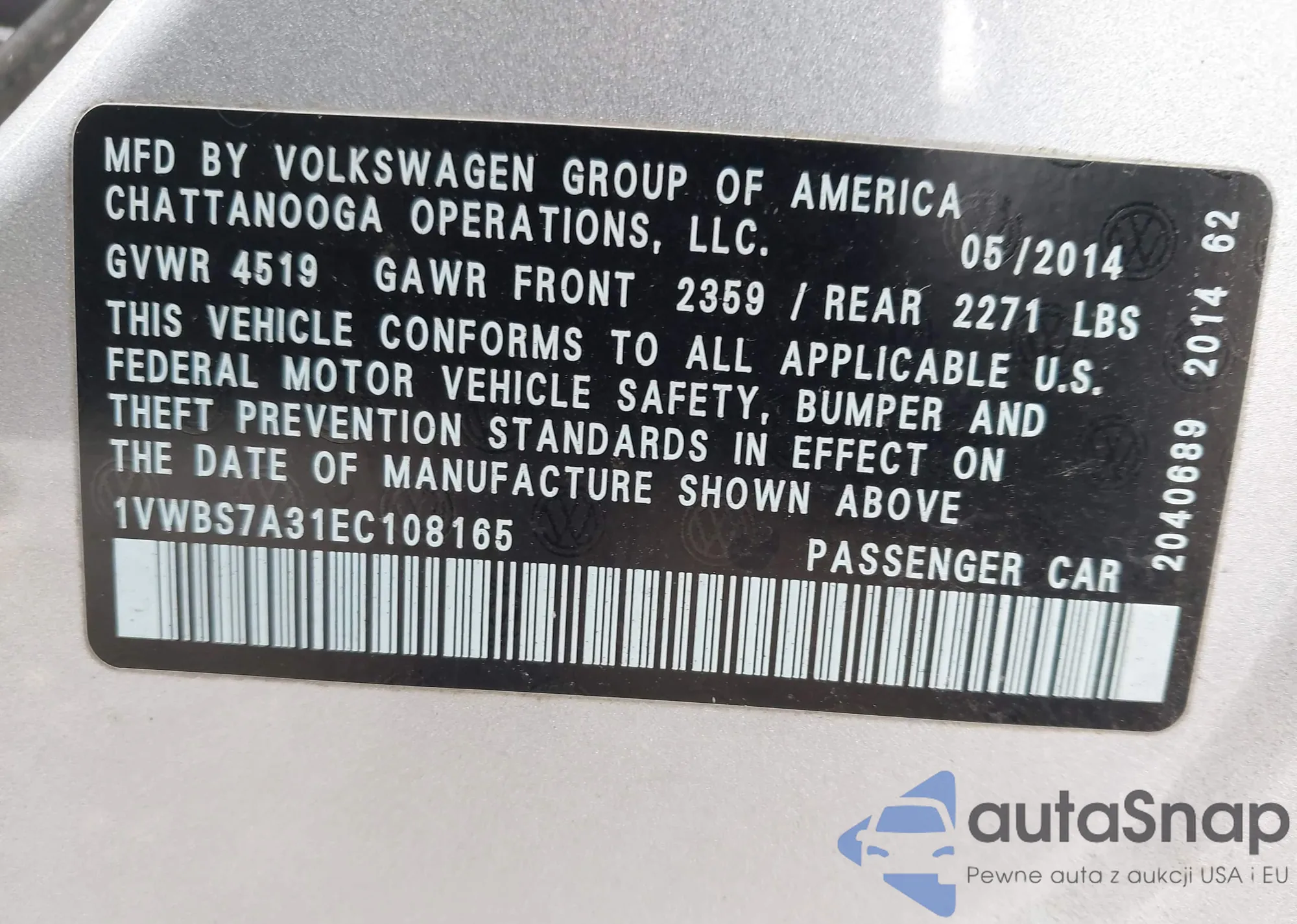 LOT: 43864433 VIN: 1VWBS7A31EC108165