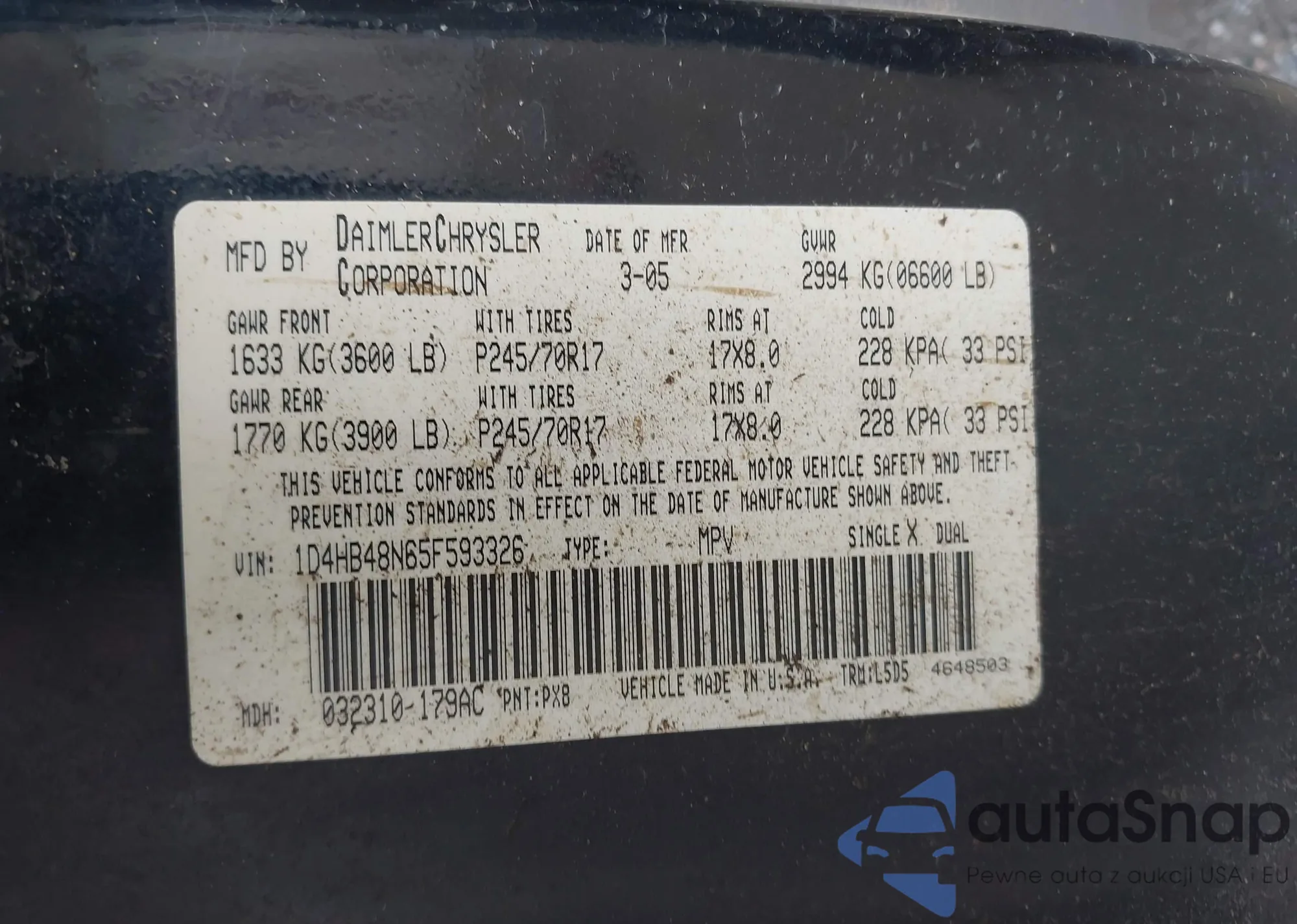 LOT: 42975830 VIN: 1D4HB48N65F593326