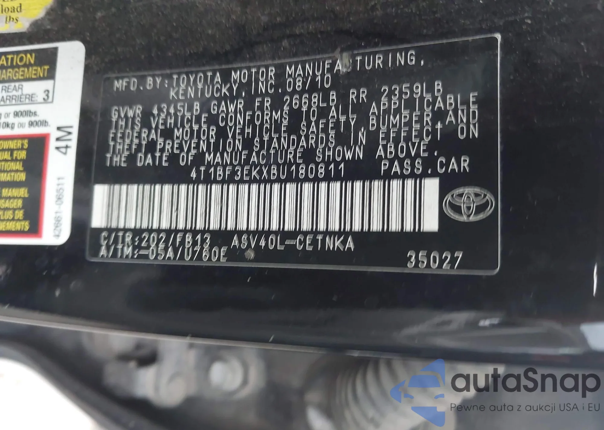 • VIN 4T1BF3EKXBU180811