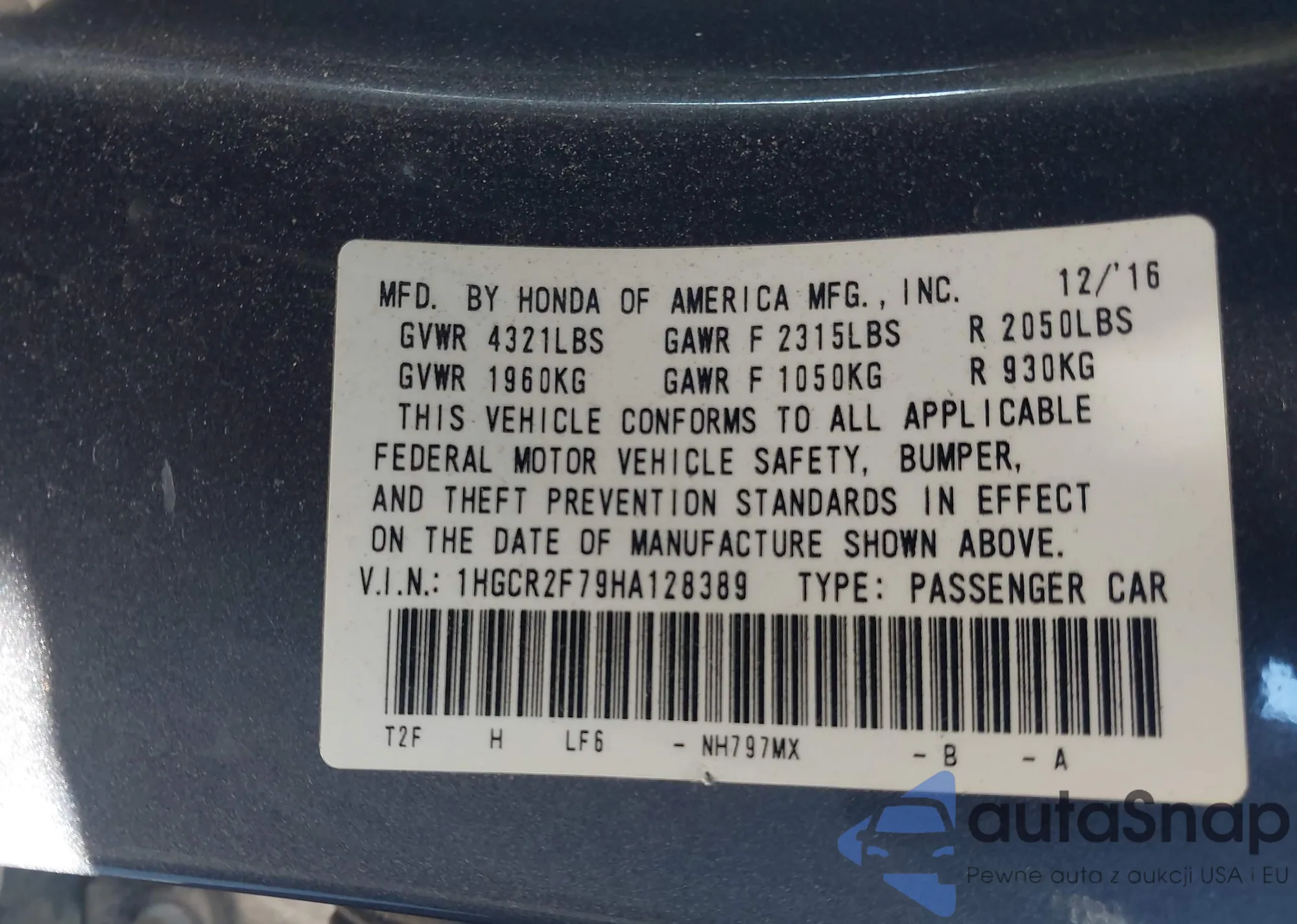 LOT: 41037635 VIN: 1HGCR2F79HA128389