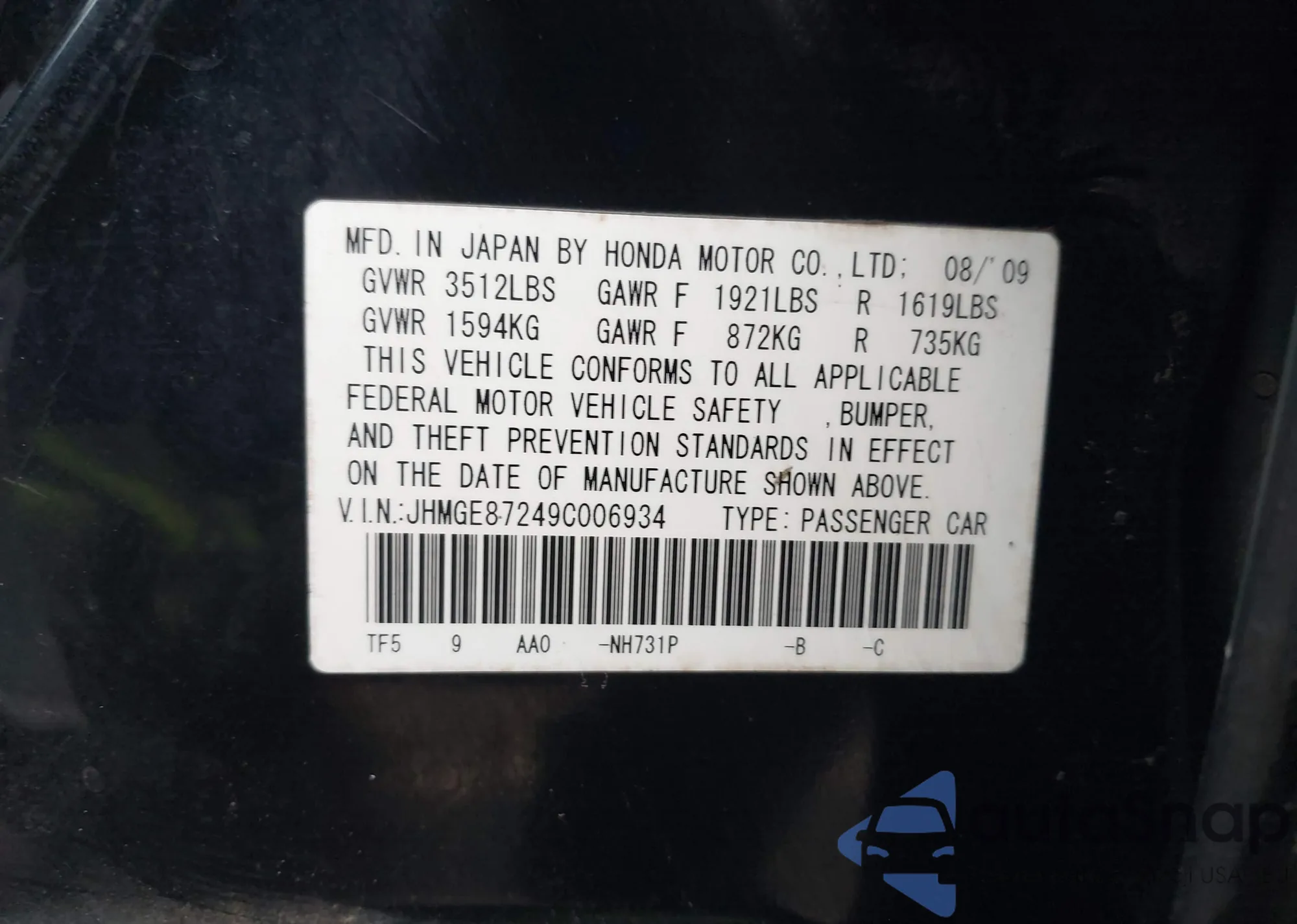 LOT: 43736606 VIN: JHMGE87249C006934