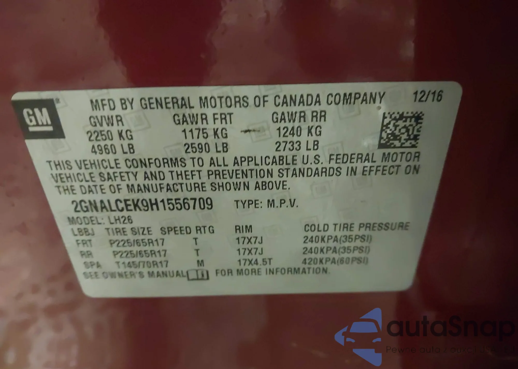 LOT: 43830749 VIN: 2GNALCEK9H1556709