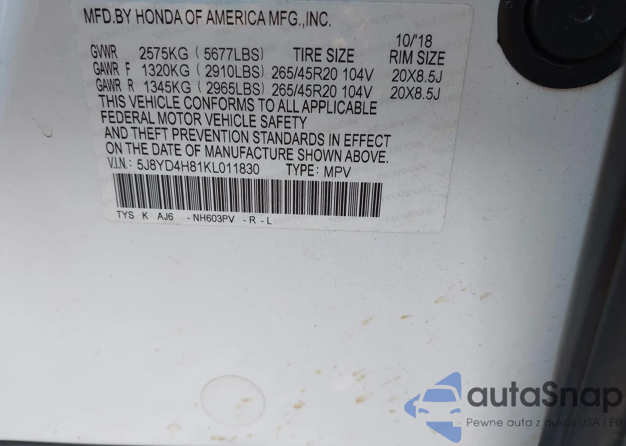LOT: 43834596 VIN: 1HGCV1F12KA104833