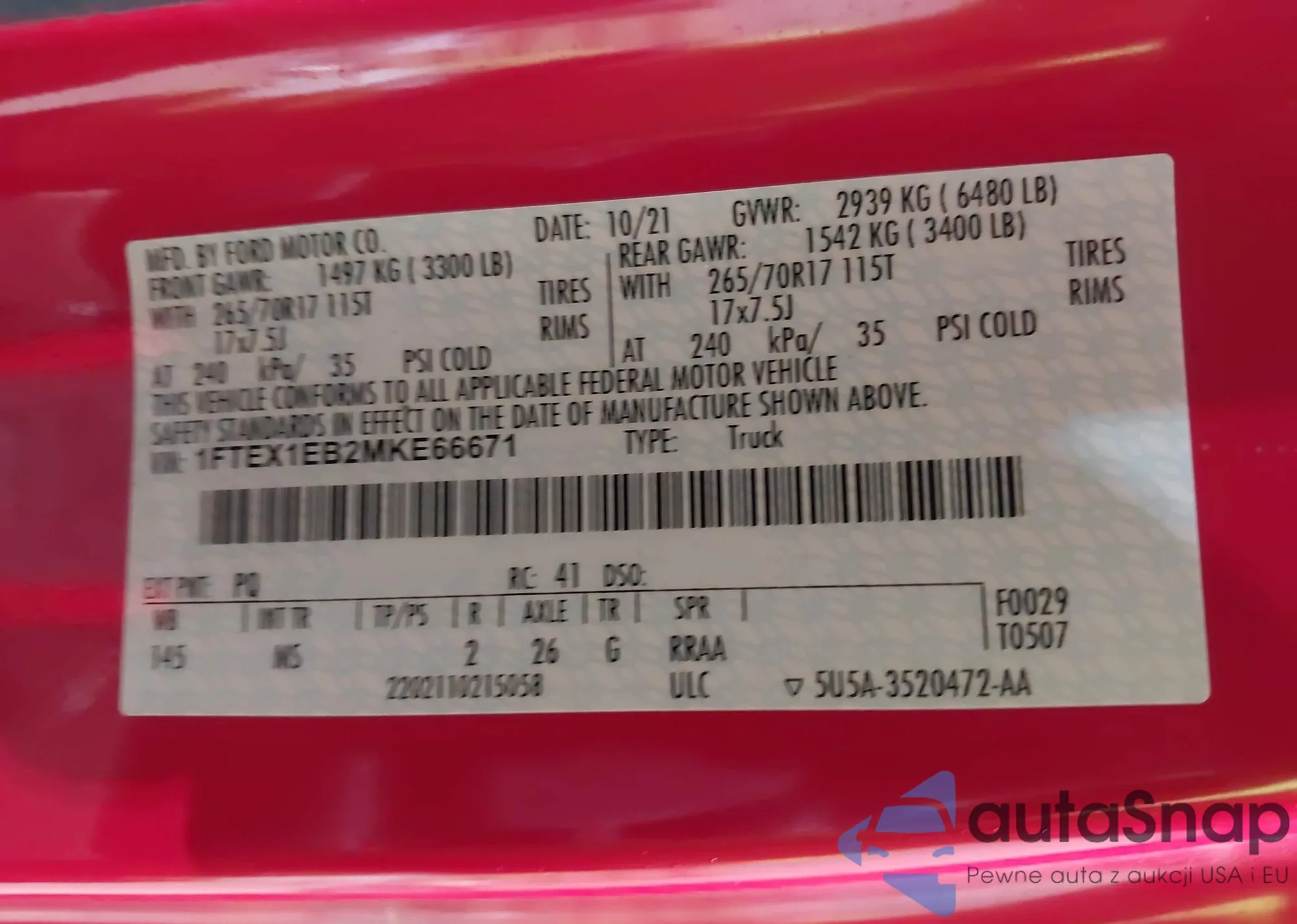 LOT: 43822772 VIN: 1FTEX1EB2MKE66671