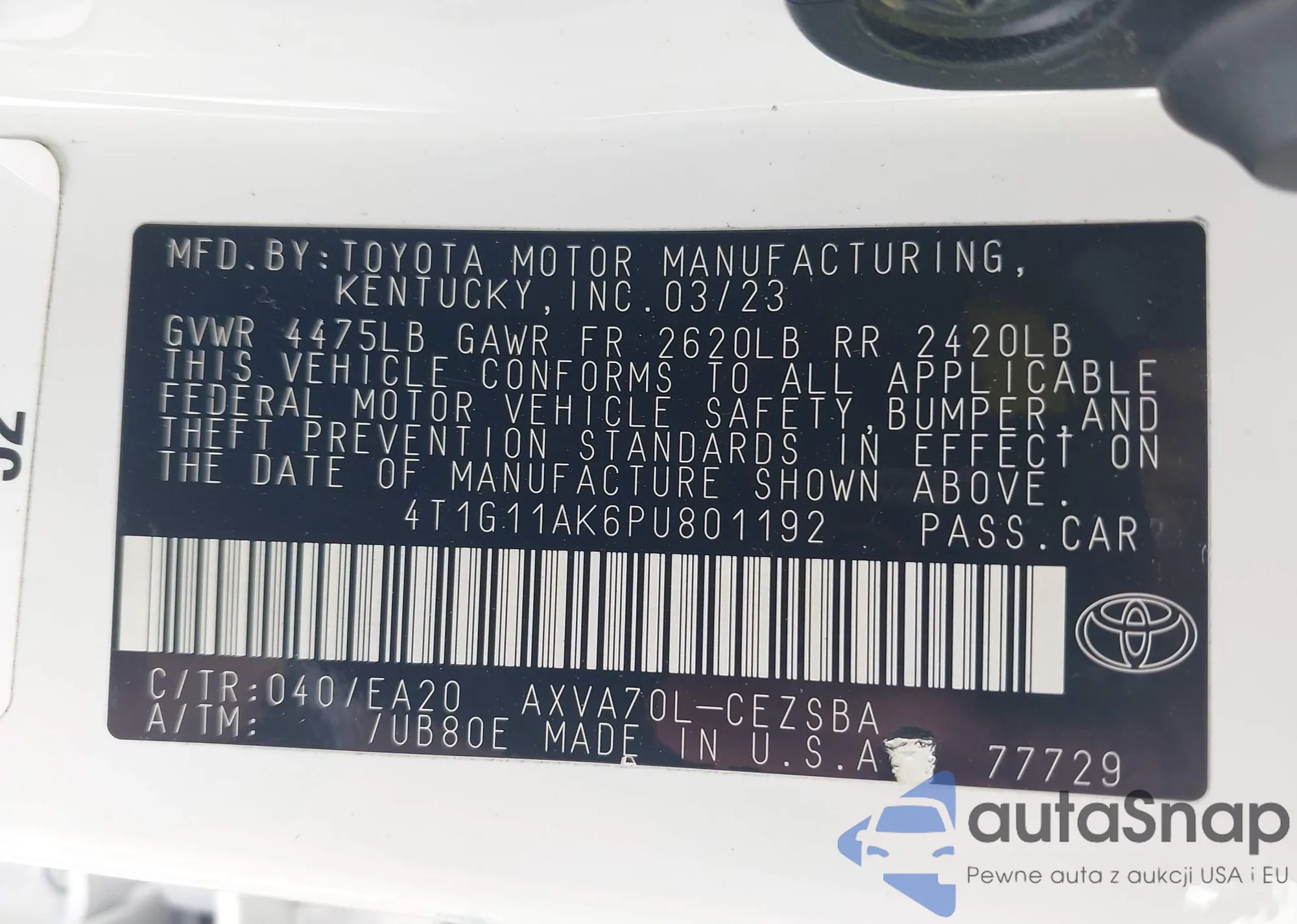 • VIN 4T1BE46KX9U895833