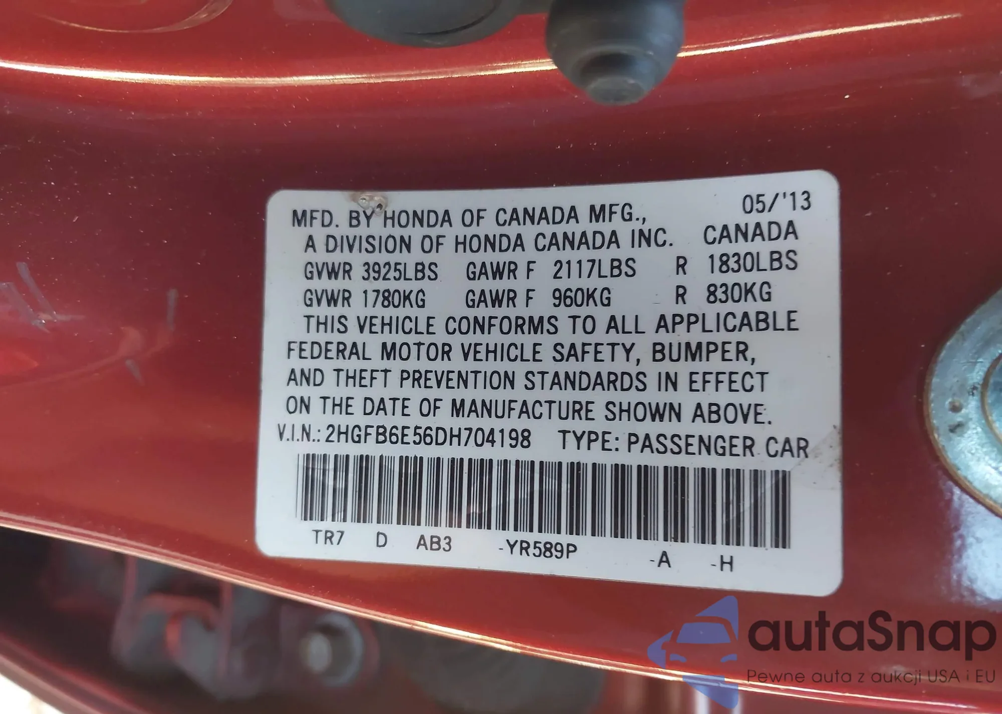 LOT: 43949133 VIN: 2HGFB6E56DH704198