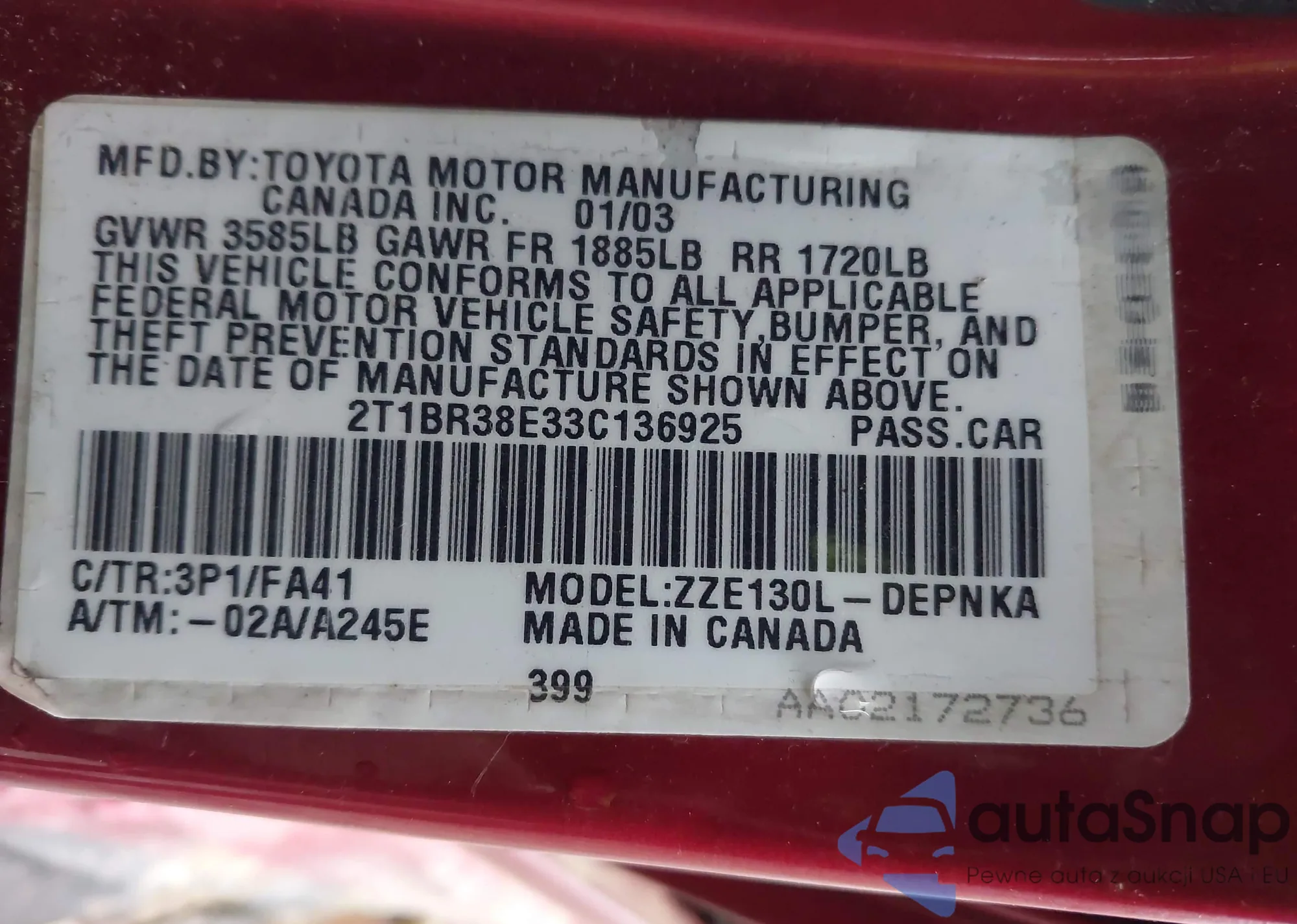 • VIN 2T1BR38E33C136925
