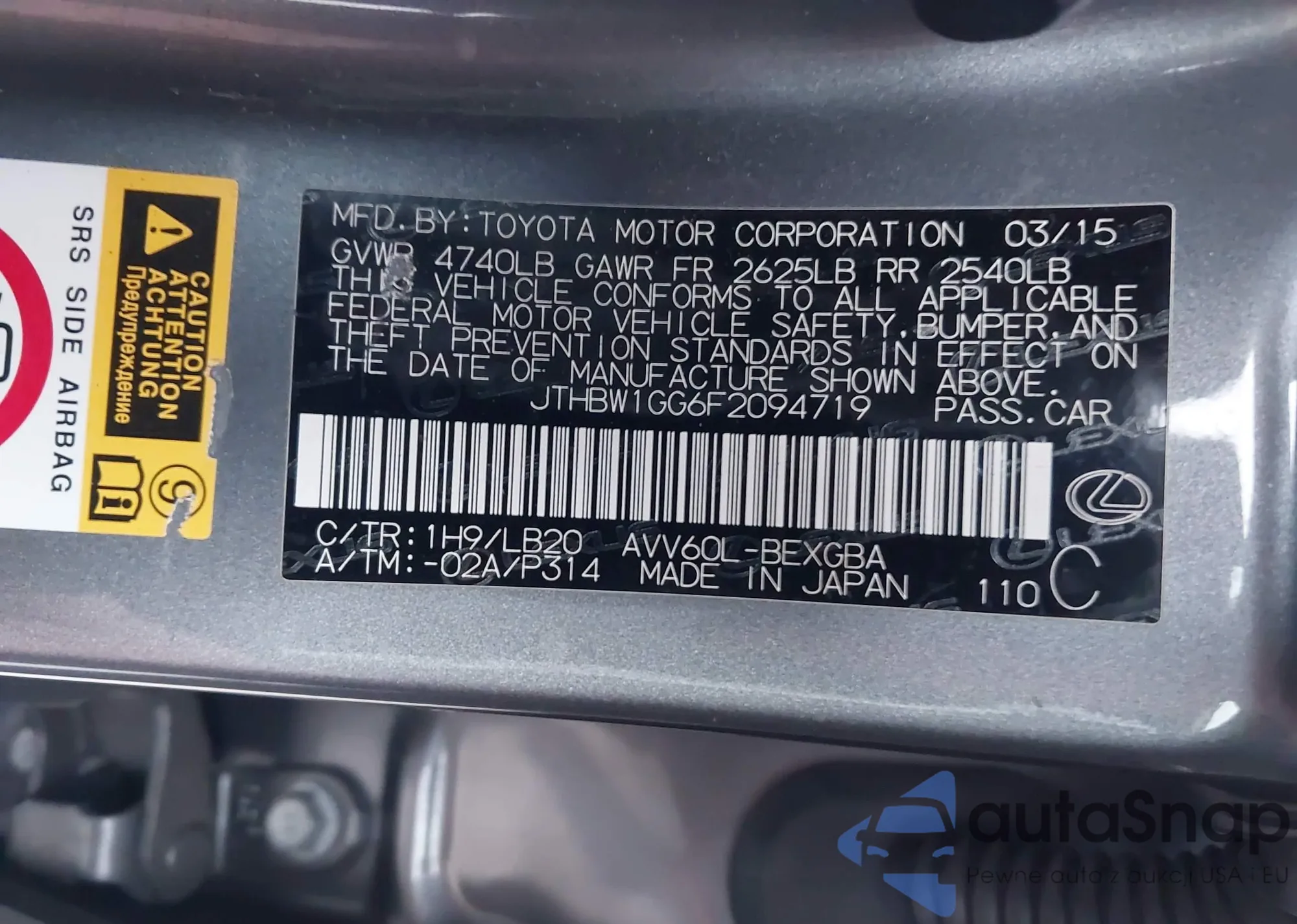 LOT: 44012698 VIN: JTHBW1GG6F2094719