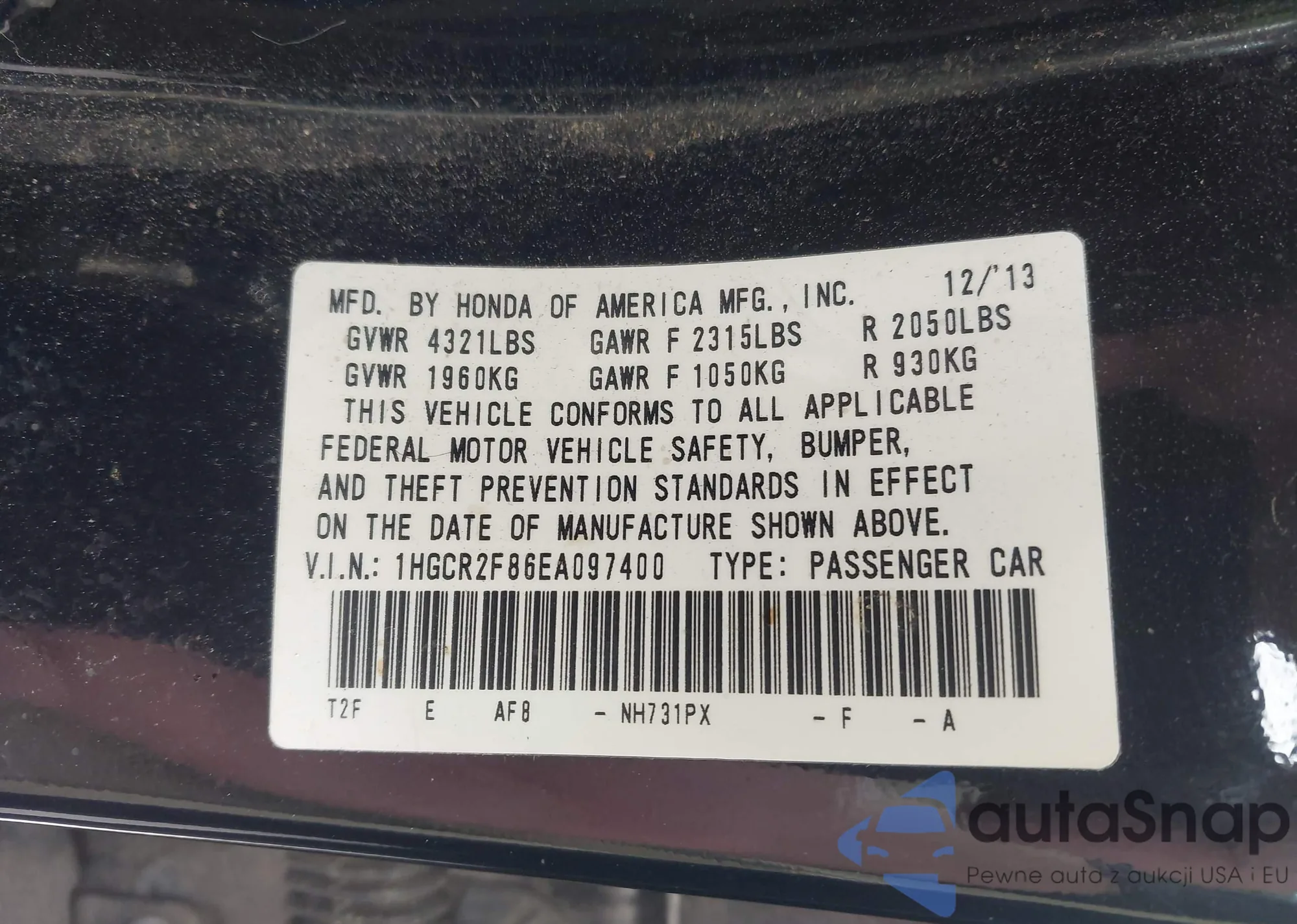 • VIN 1HGCR2F86EA097400