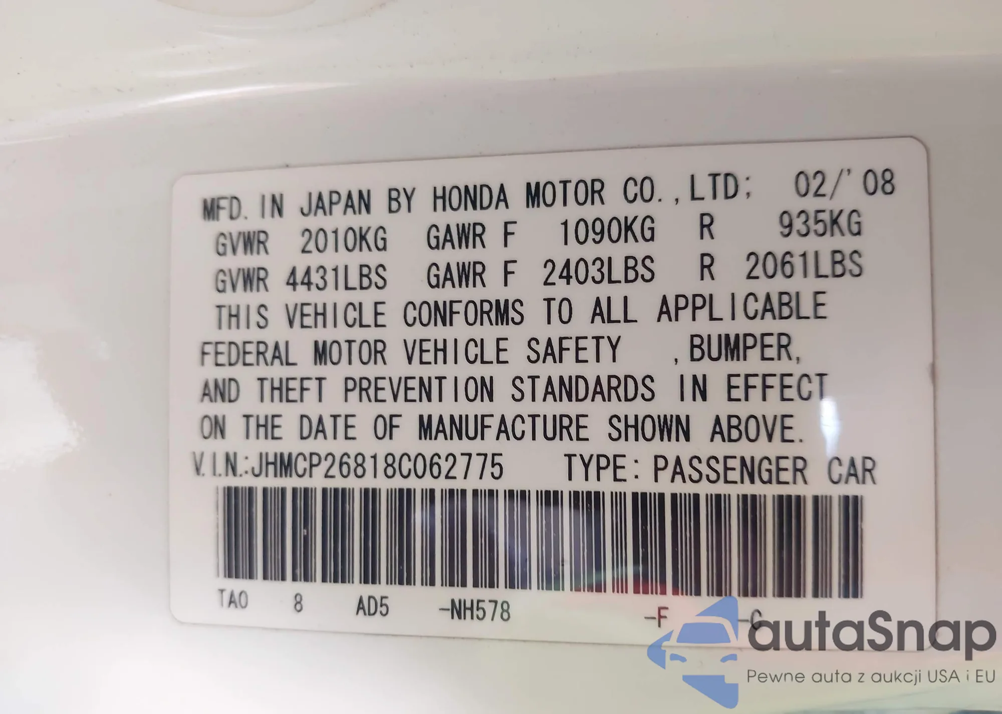 LOT: 43890540 VIN: JH4DC54836S003847