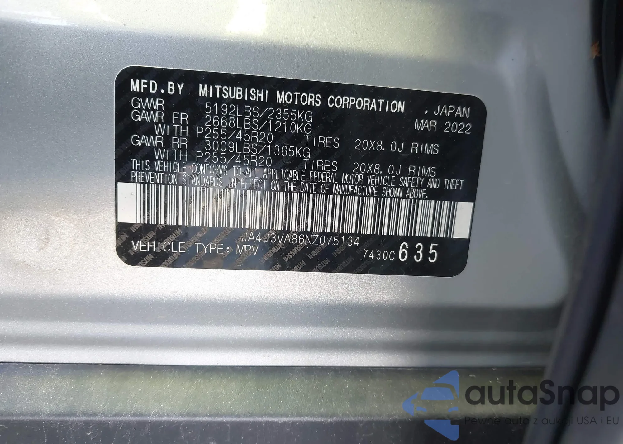 LOT: 43758329 VIN: JA4J3VA86NZ075134