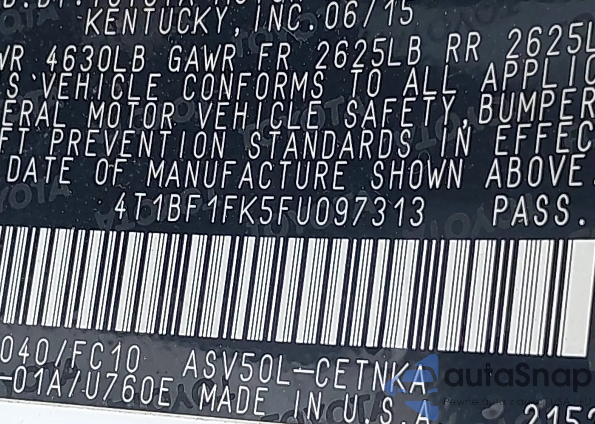• VIN 4T1BF1FK5FU097313
