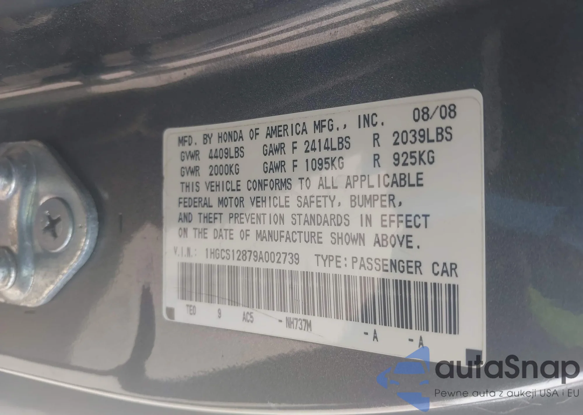• VIN 2HGFB2F58DH551217