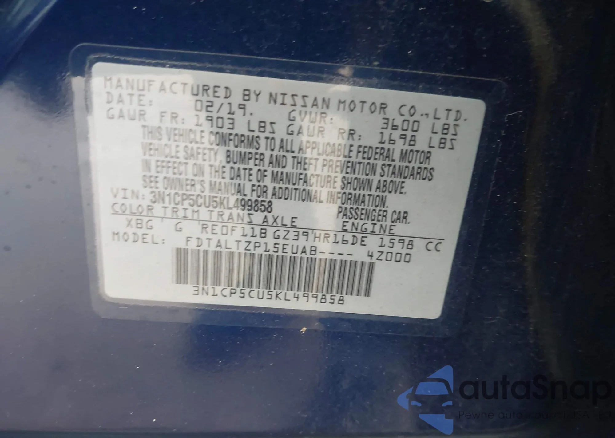 LOT: 43509386 VIN: 3N1CP5CU5KL499858