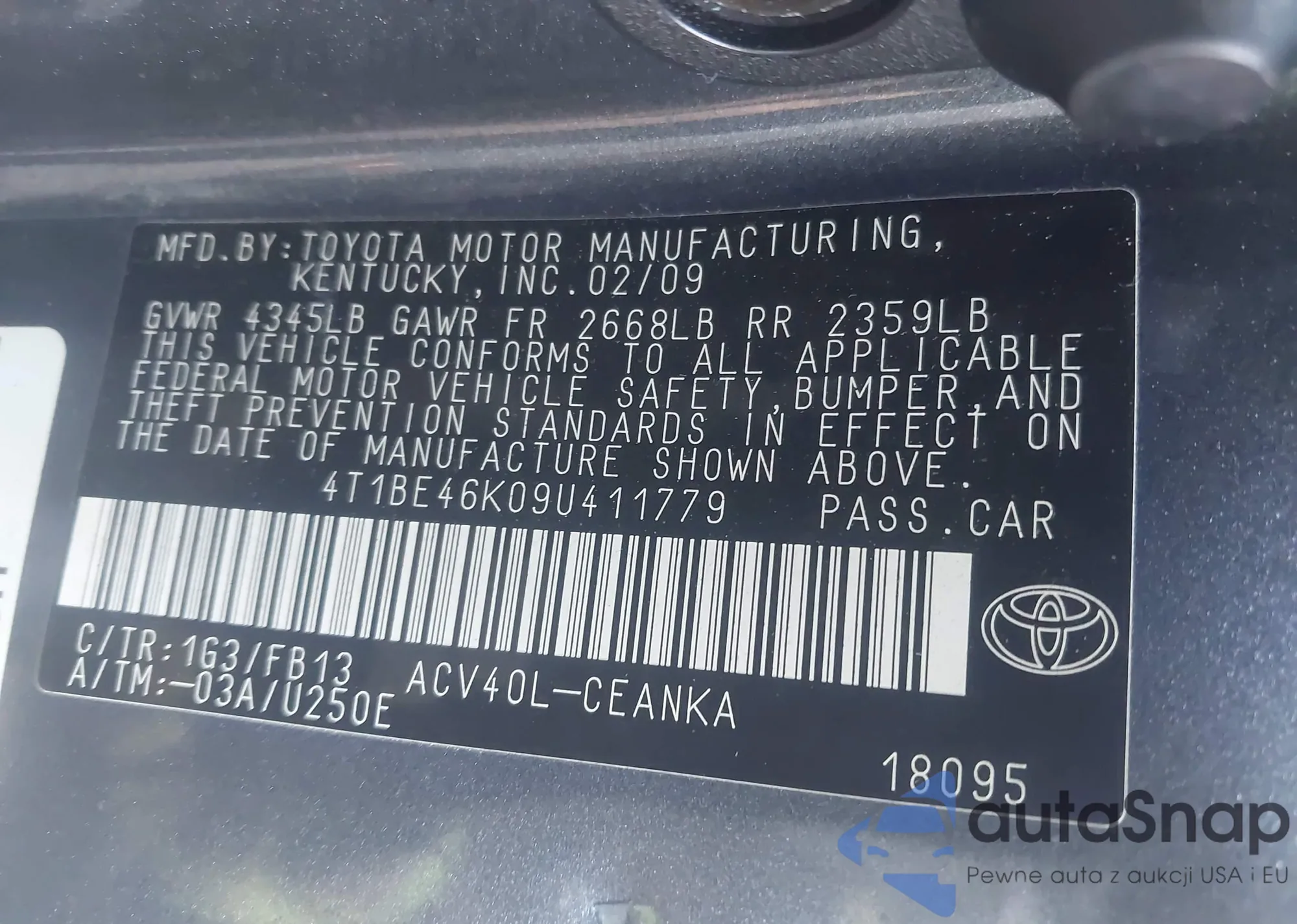 • VIN 4T1BE46K09U411779