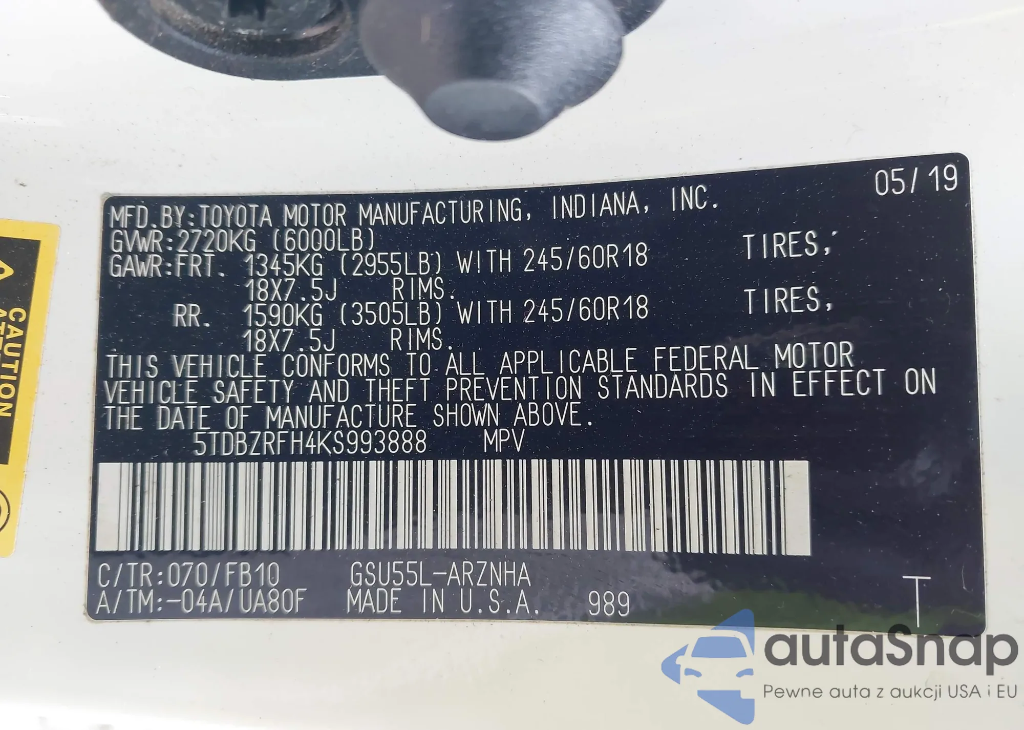 LOT: 43891626 VIN: 5TDBZRFH4KS993888