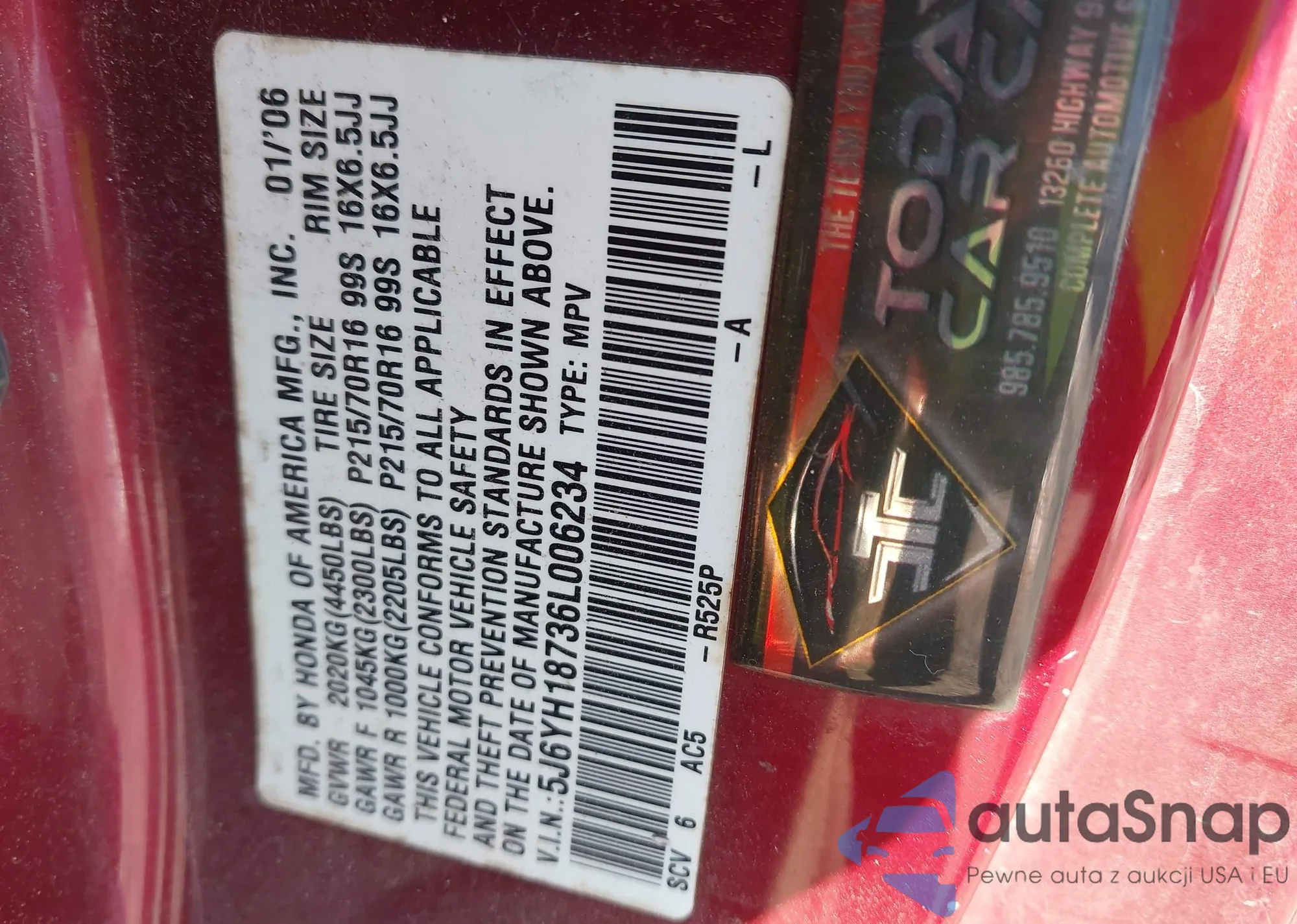 • VIN 5J6YH18736L006234