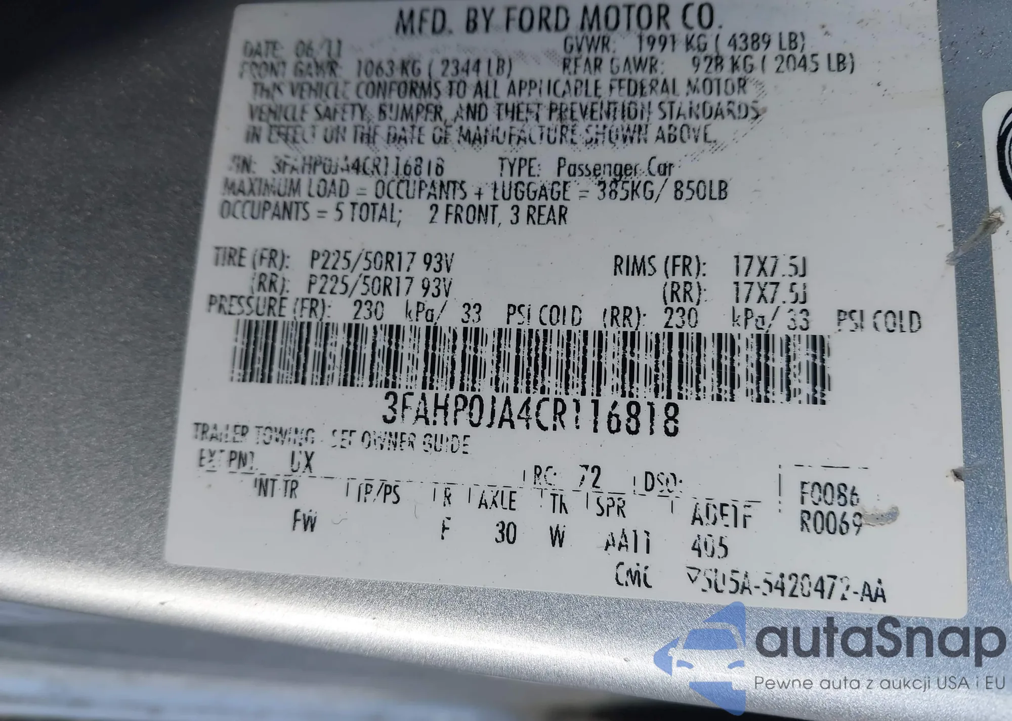 • VIN 3FAHP0JA4CR116818