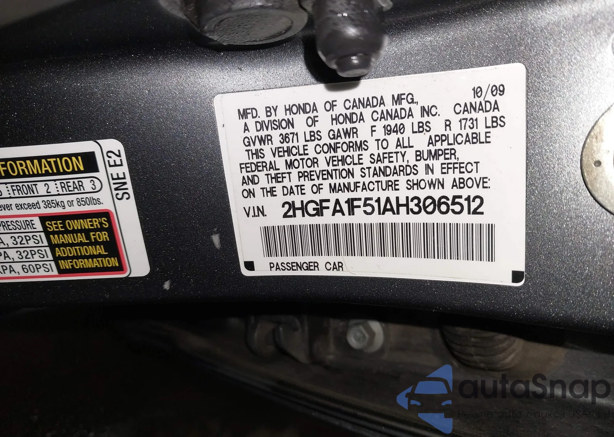 LOT: 43995692 VIN: 2HGFA1F51AH306512