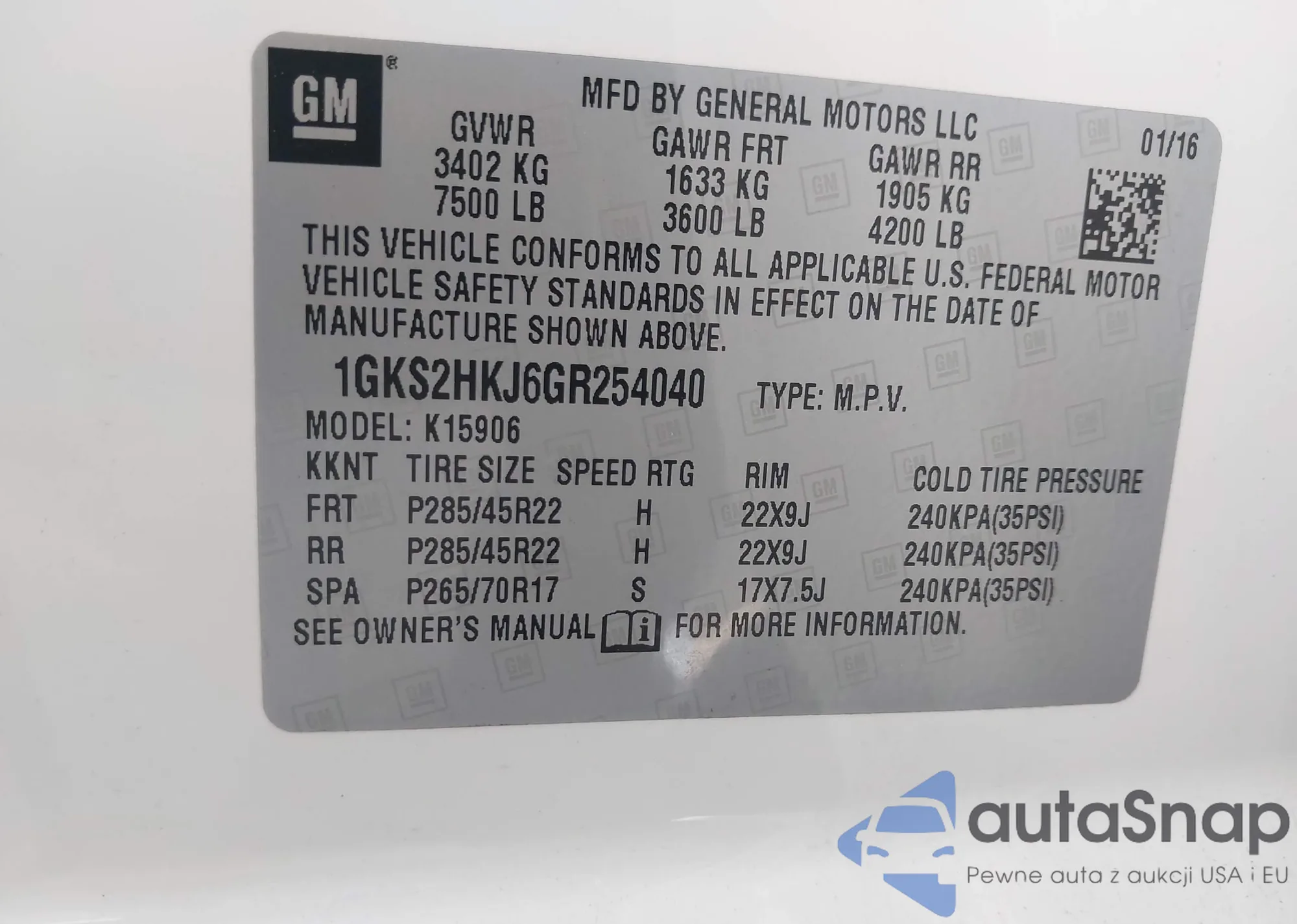 LOT: 43496644 VIN: 1GKS2HKJ6GR254040
