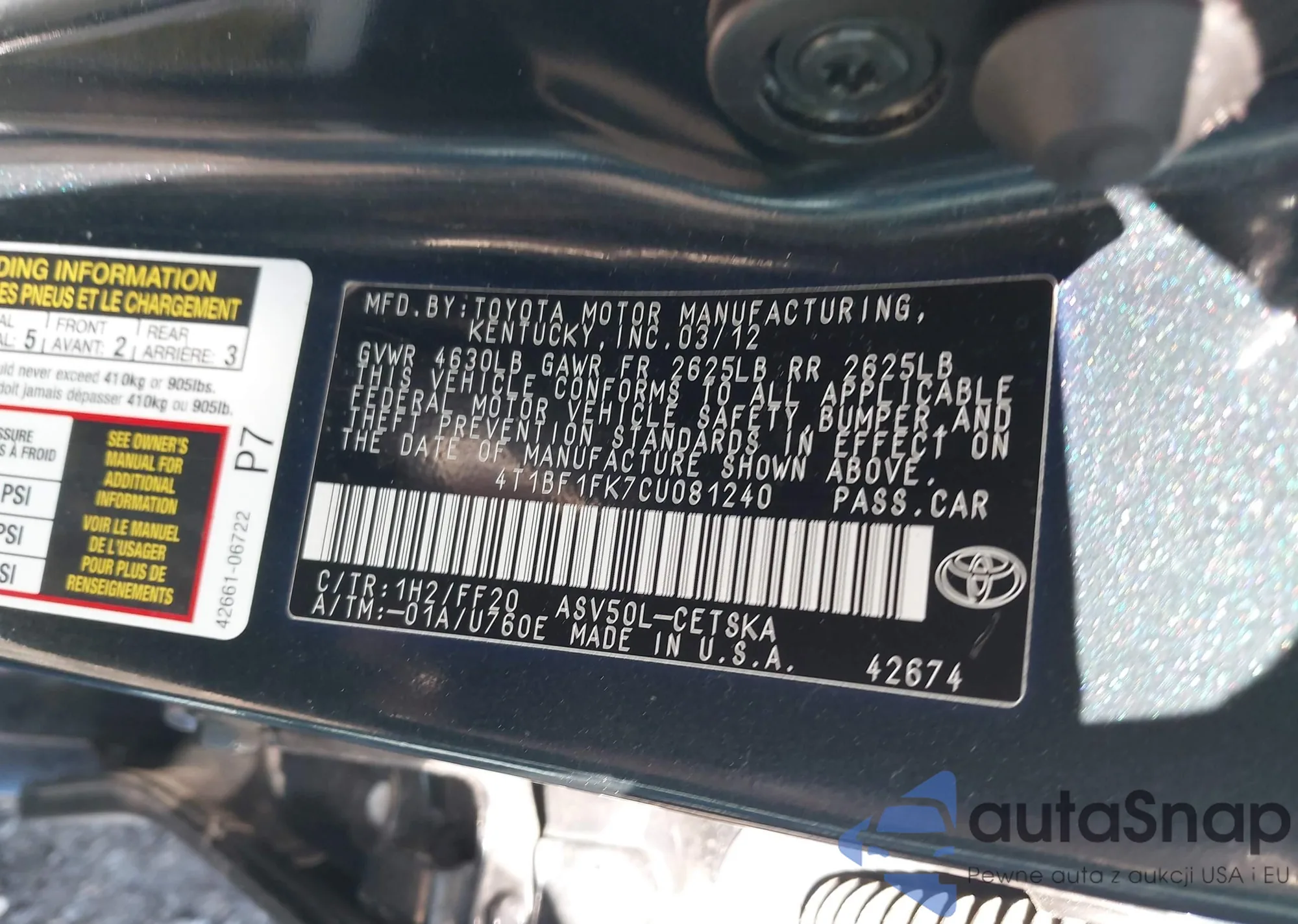 • VIN 4T1BF1FK7CU081240