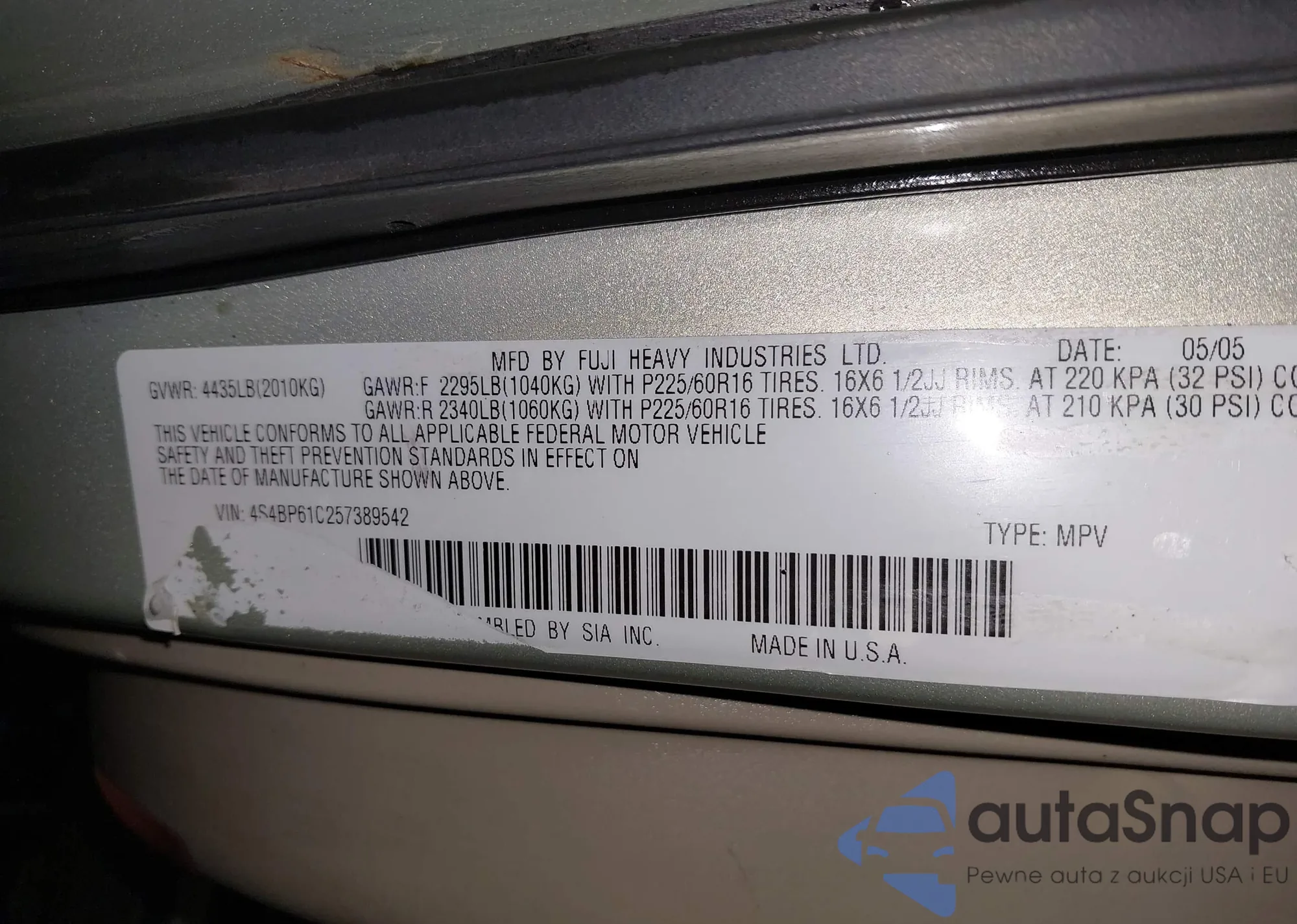 2005 Subaru Outback 2.5I from USA, damaged, VIN 4S4BP61C257389542