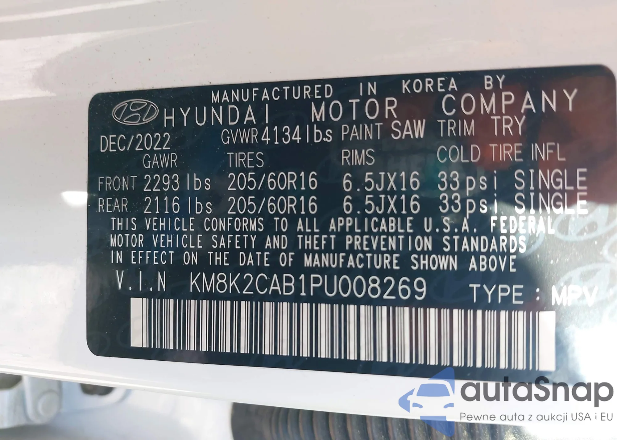 LOT: 43701361 VIN: KM8K2CAB1PU008269