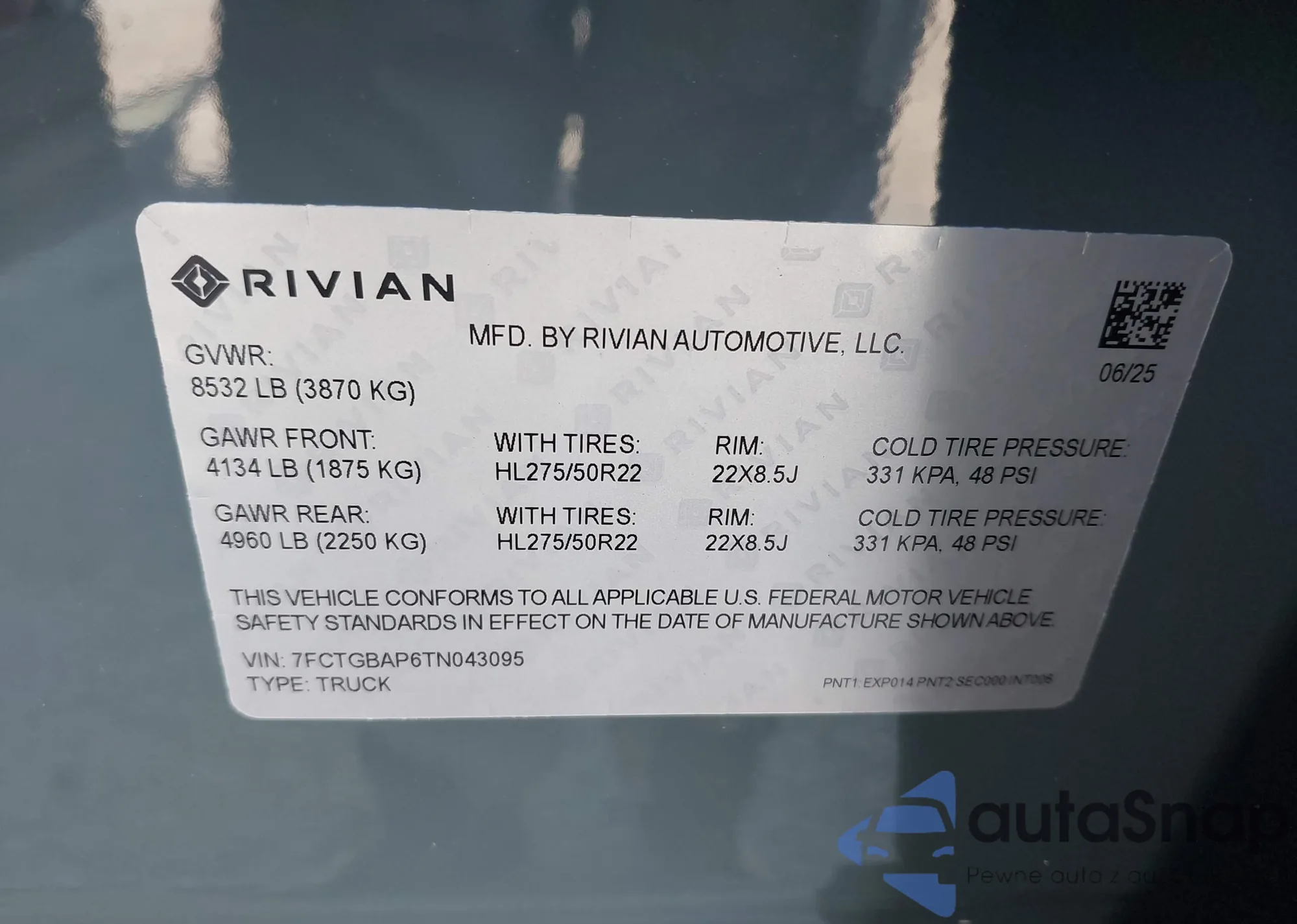 2026 Rivian R1T from USA, damaged, VIN 7FCTGBAP6TN043095