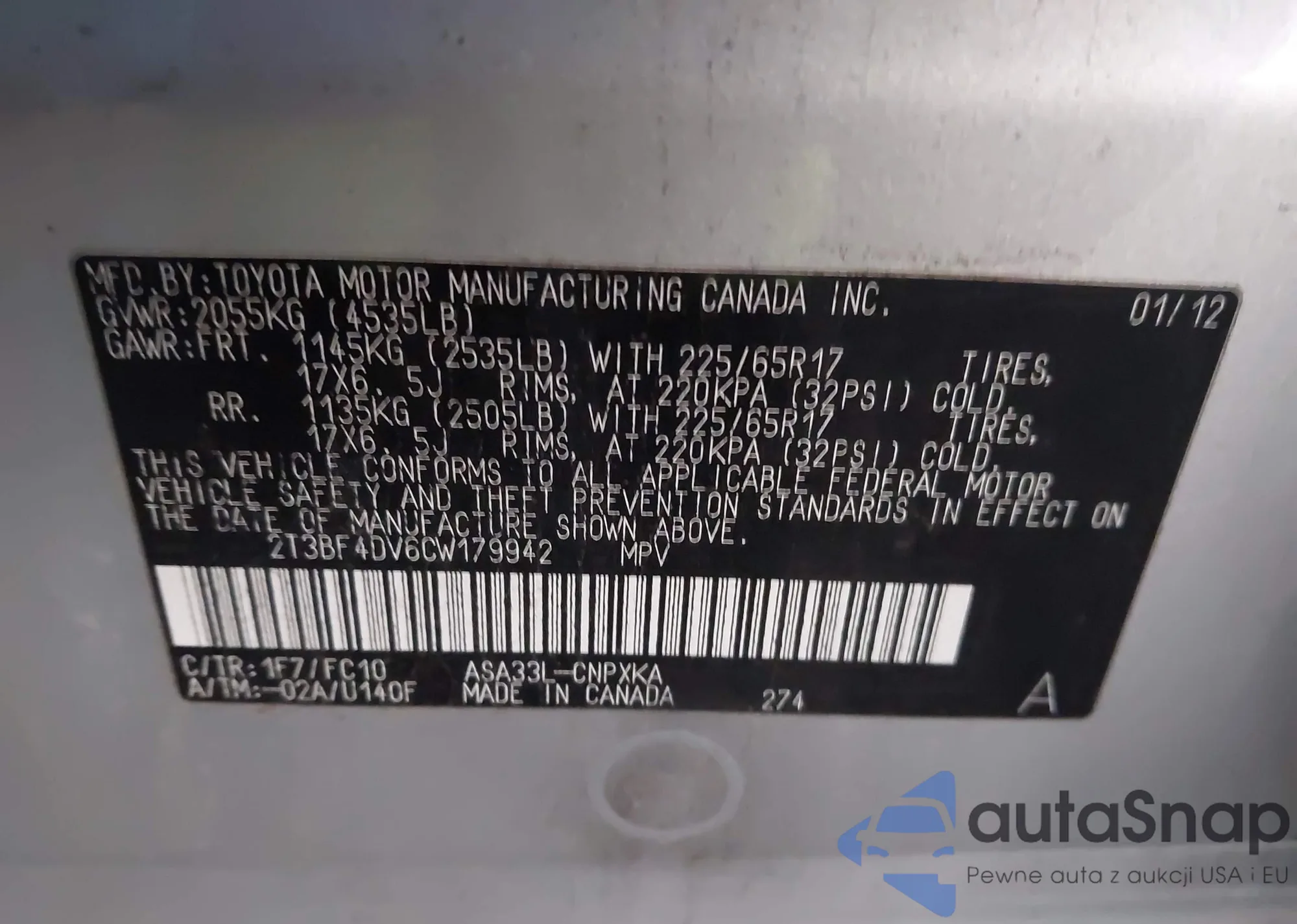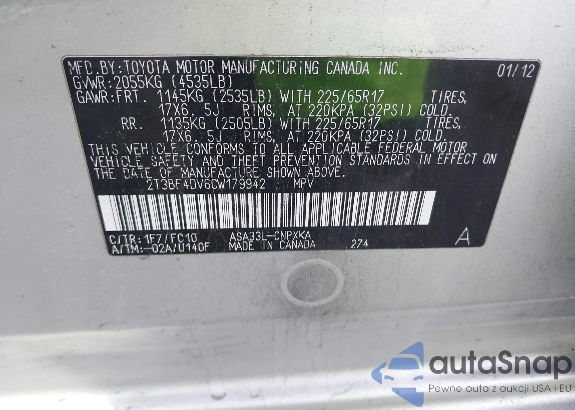 LOT: 43820670 VIN: 2T3BF4DV6CW179942