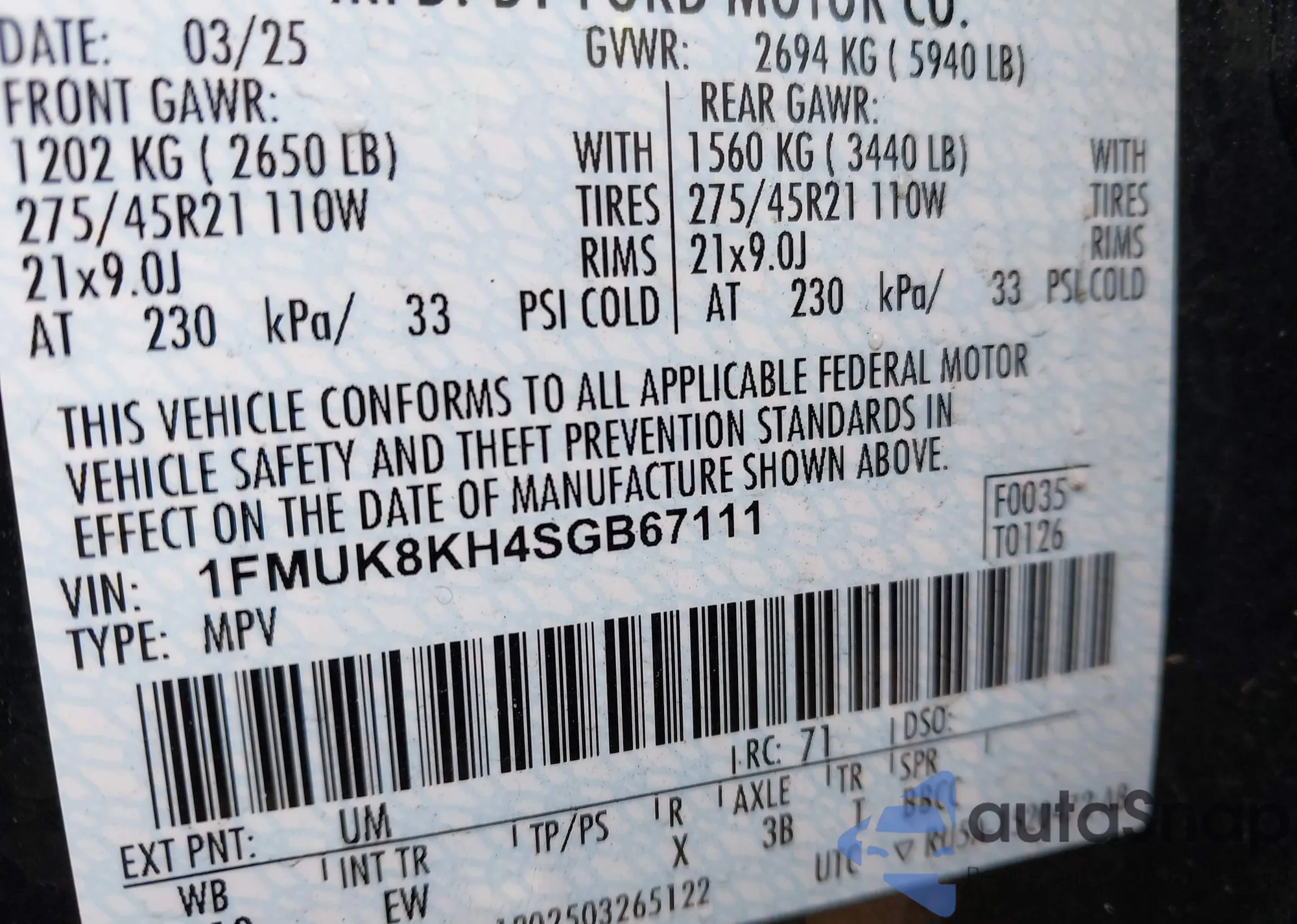 • VIN 1FMUK8KH4SGB67111