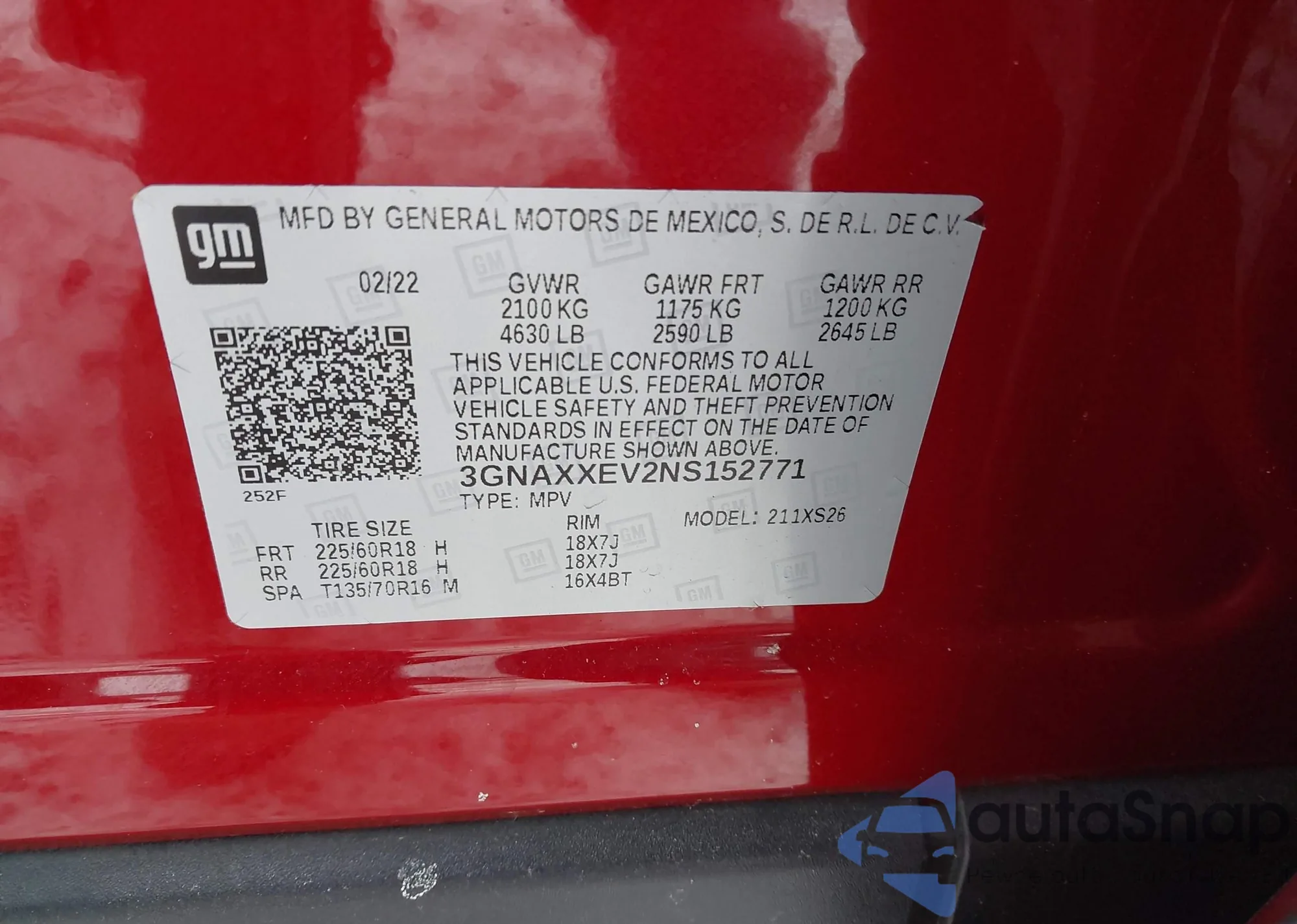 • VIN 3GNAXXEV2NS152771