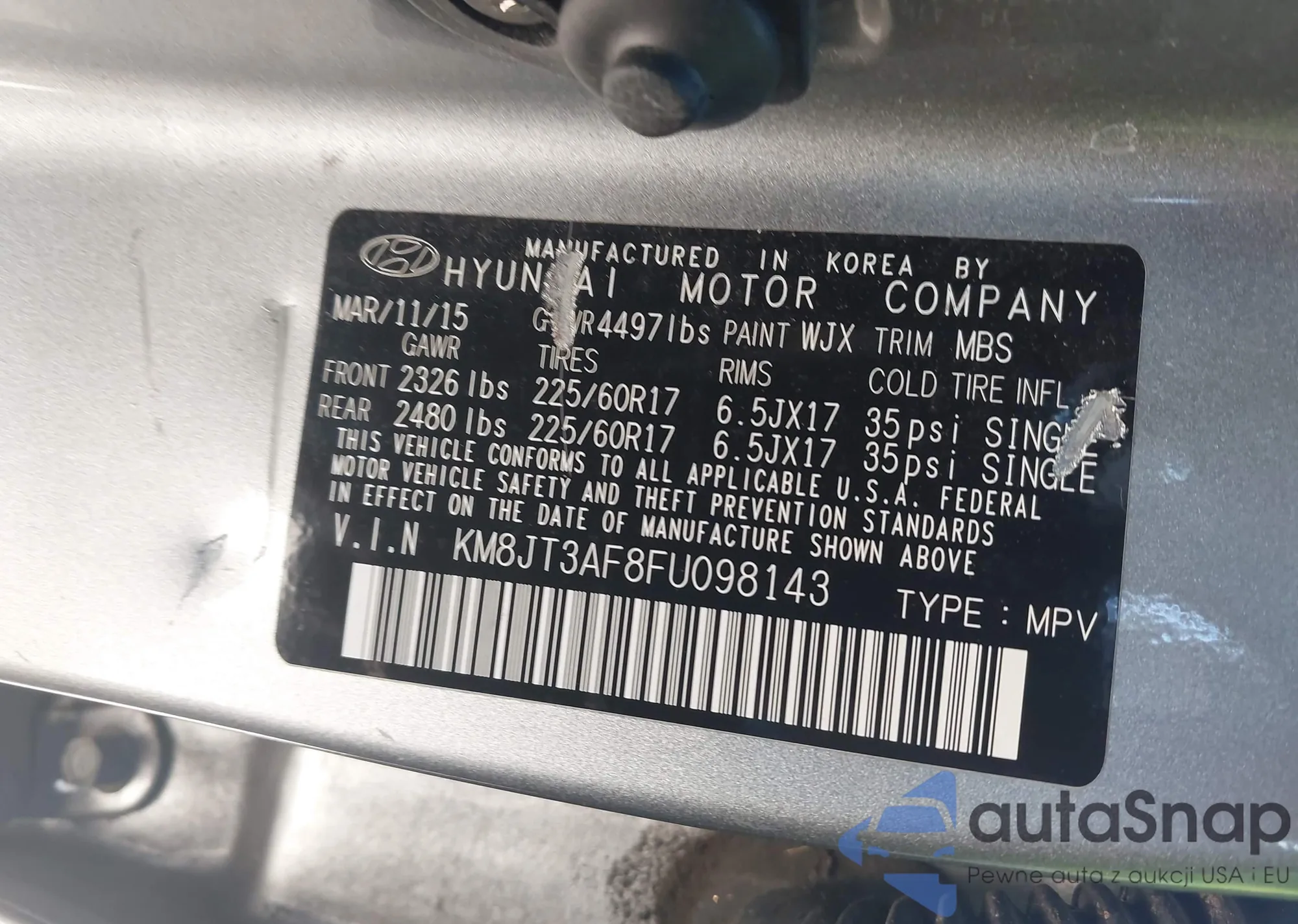 LOT: 44059707 VIN: KM8JT3AF8FU098143