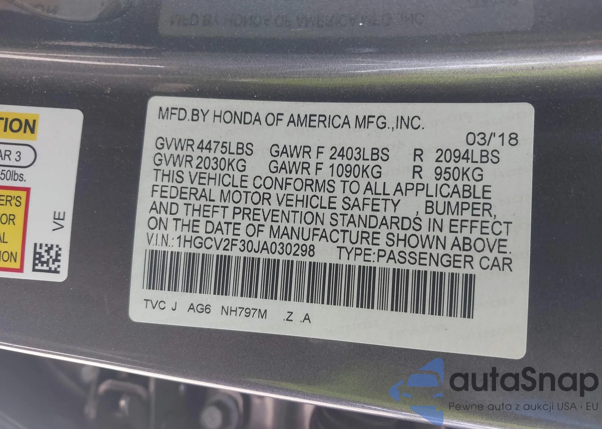 LOT: 42043657 VIN: 1HGCV2F30JA030298