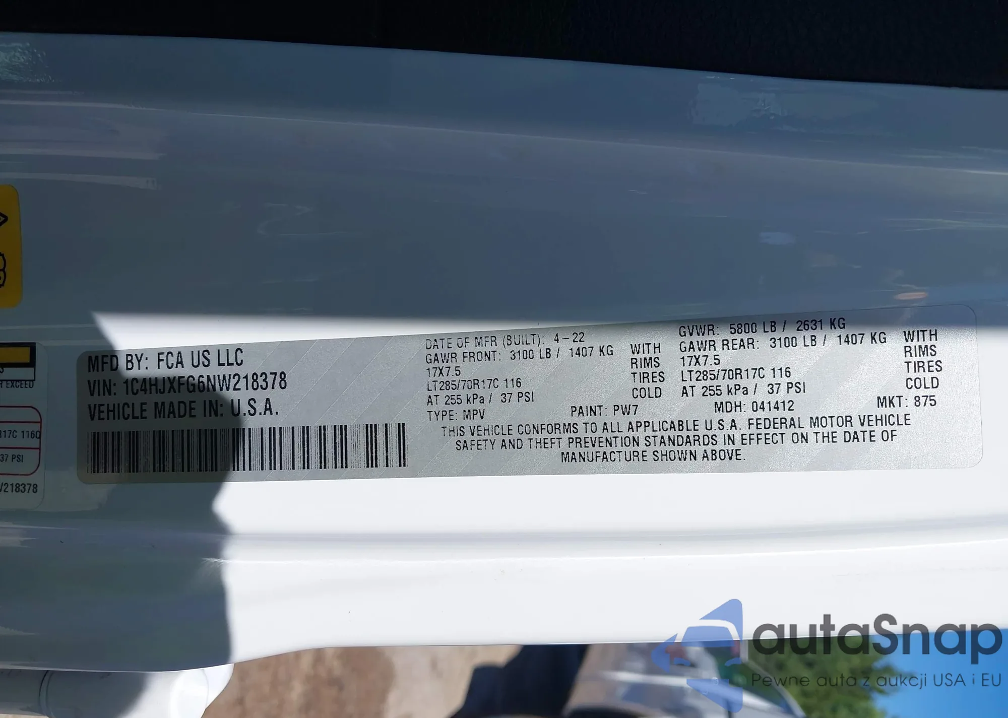 • VIN 1C4HJXFG6NW218378