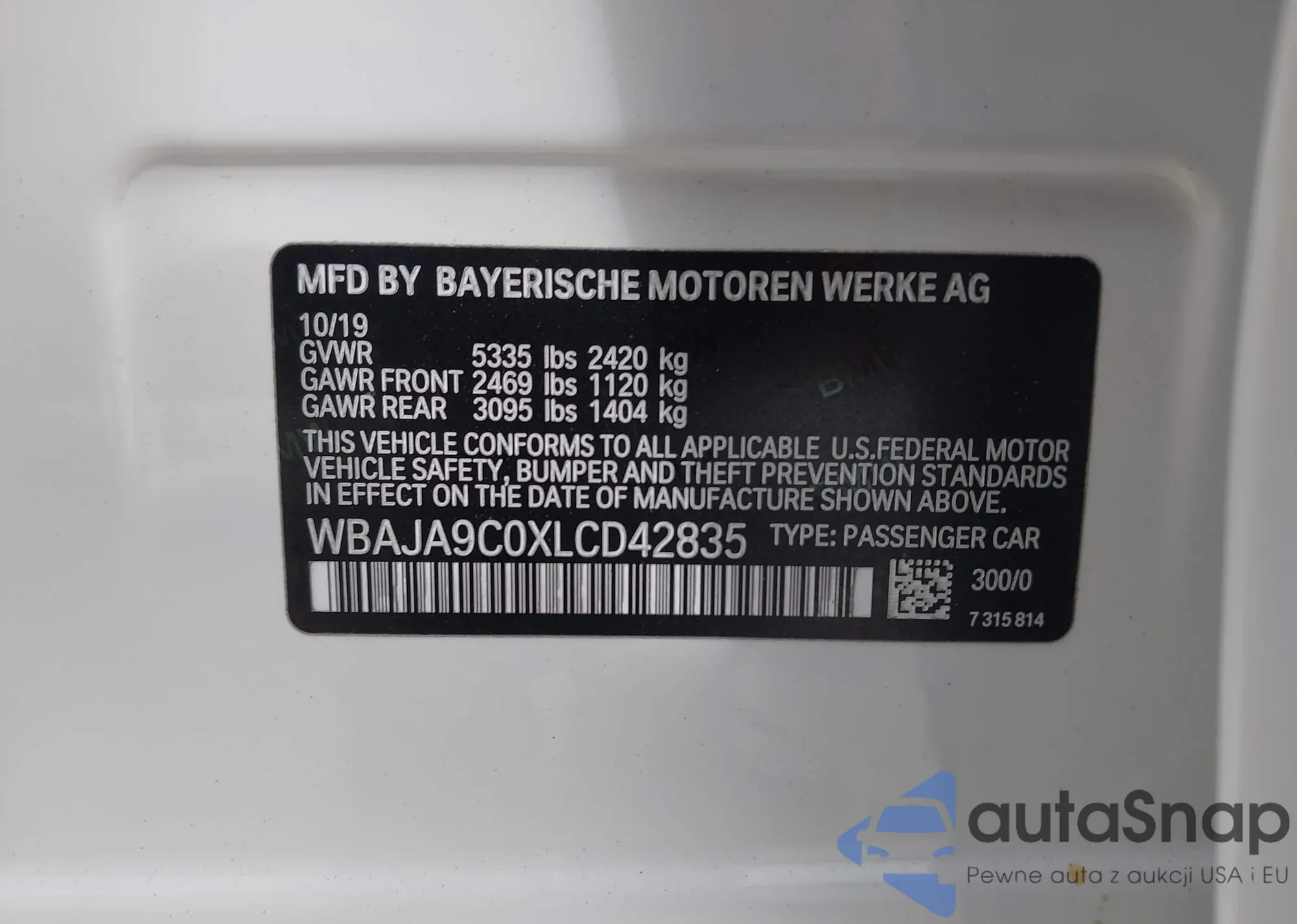 LOT: 43250335 VIN: WBAJA9C0XLCD42835