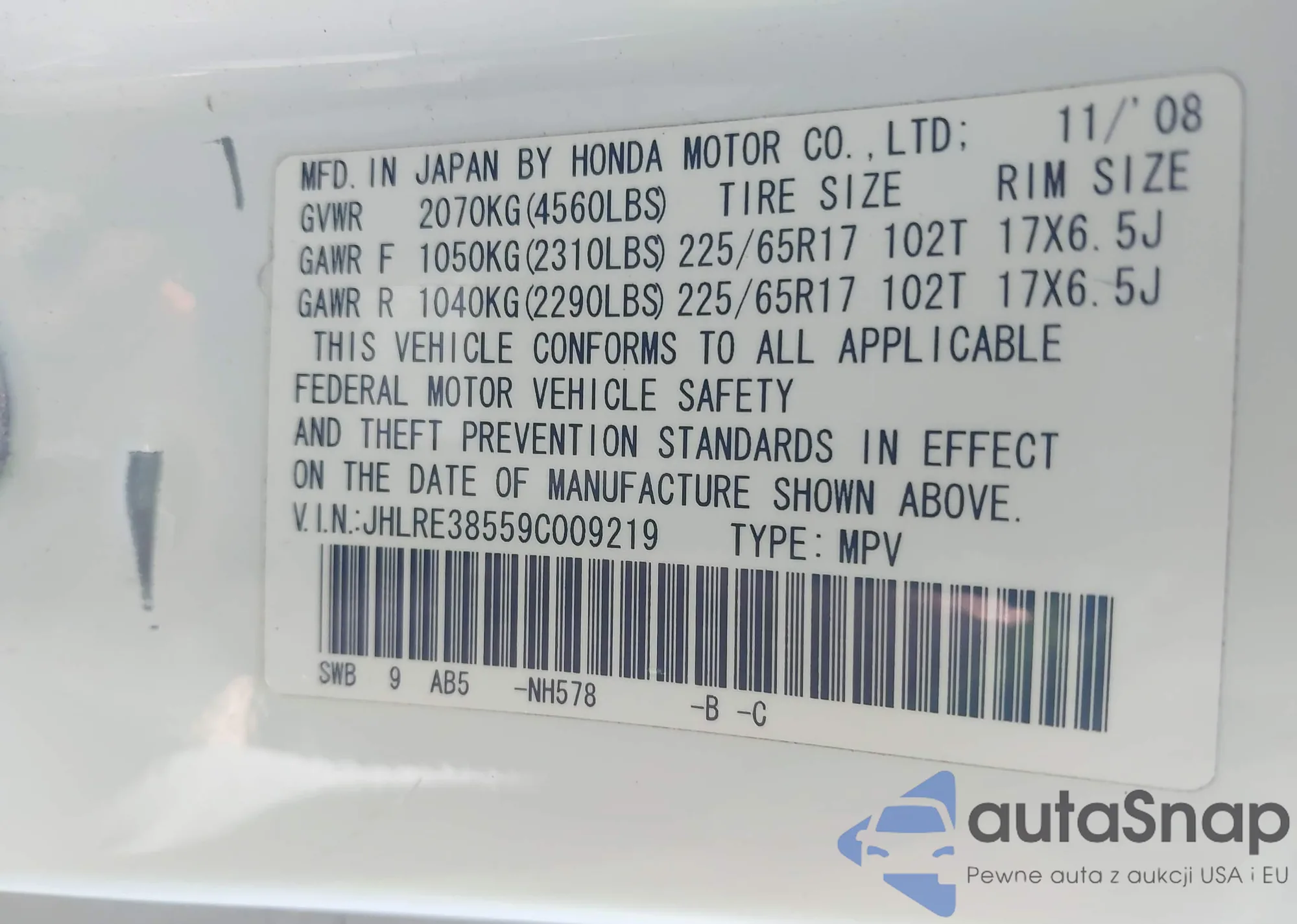 LOT: 43401756 VIN: JHLRE38559C009219