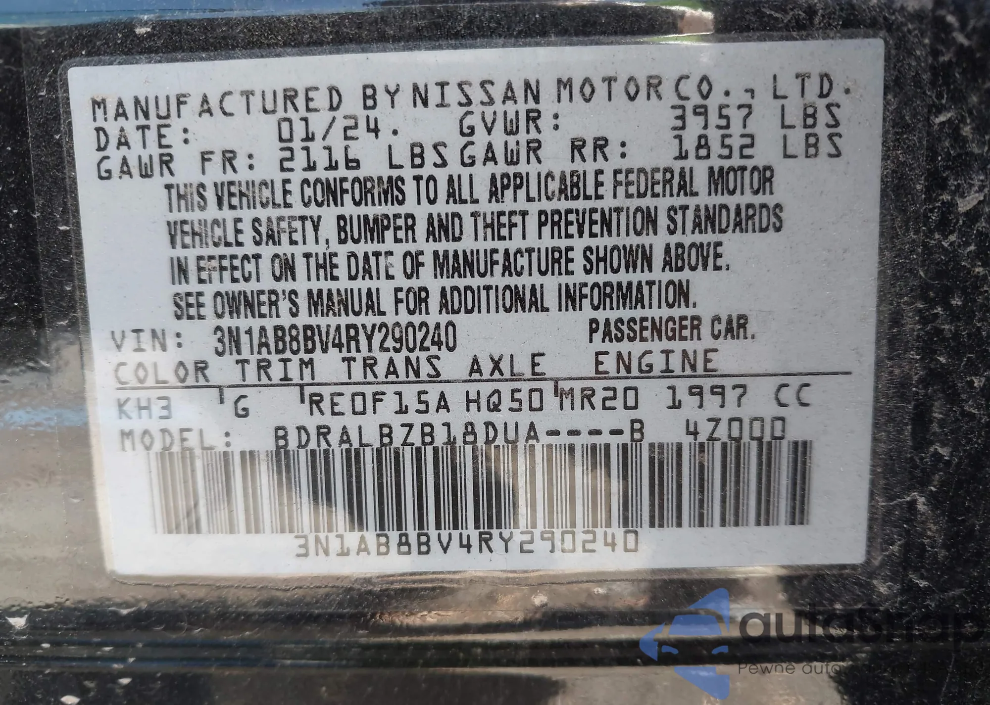 • VIN 3N1AB8BV4RY290240