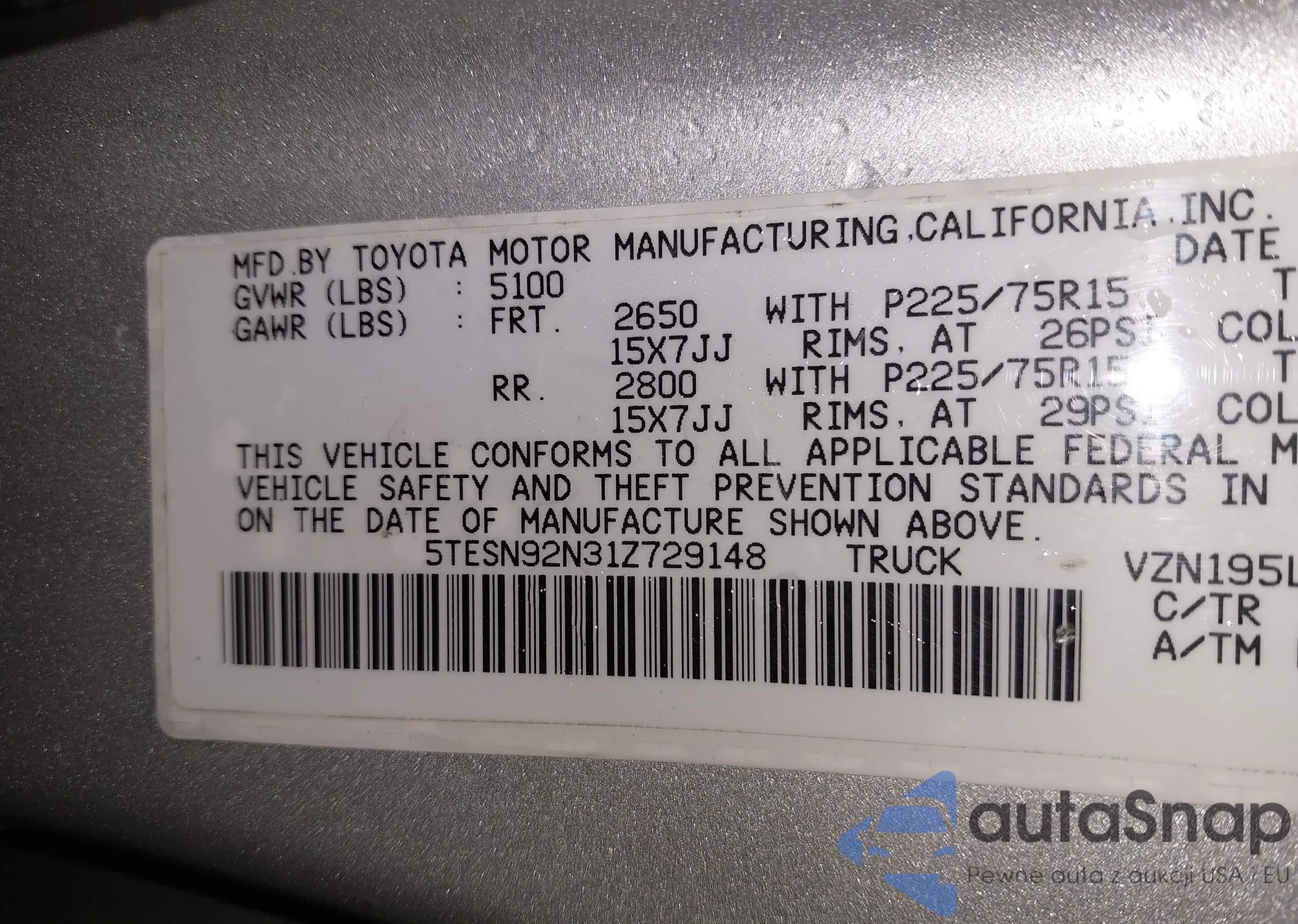 • VIN 5TESN92N31Z729148