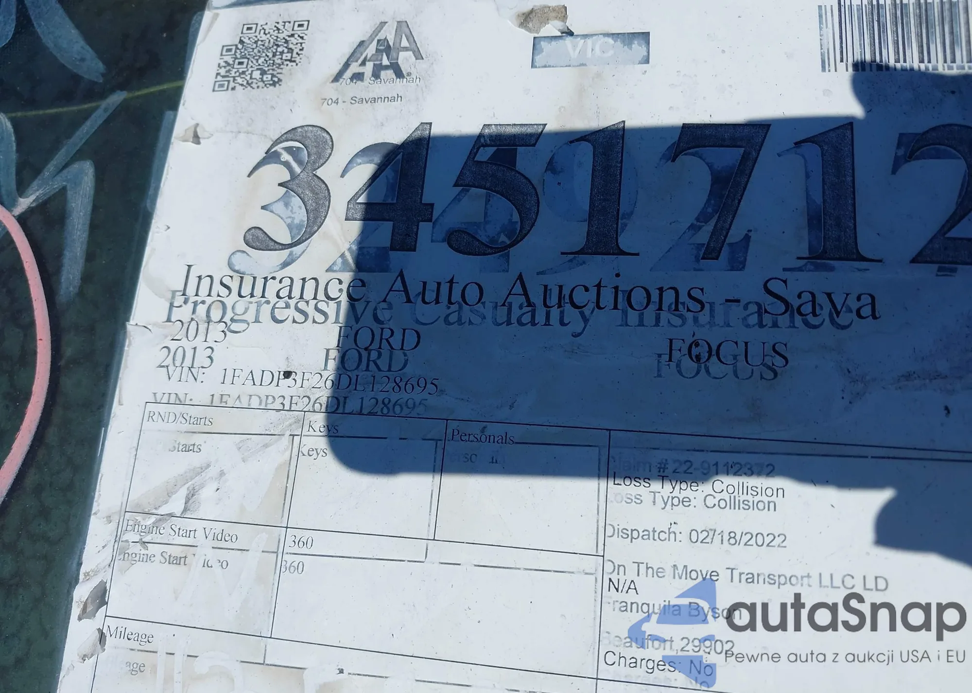 LOT: 34517124 VIN: 1FADP3F26DL128695