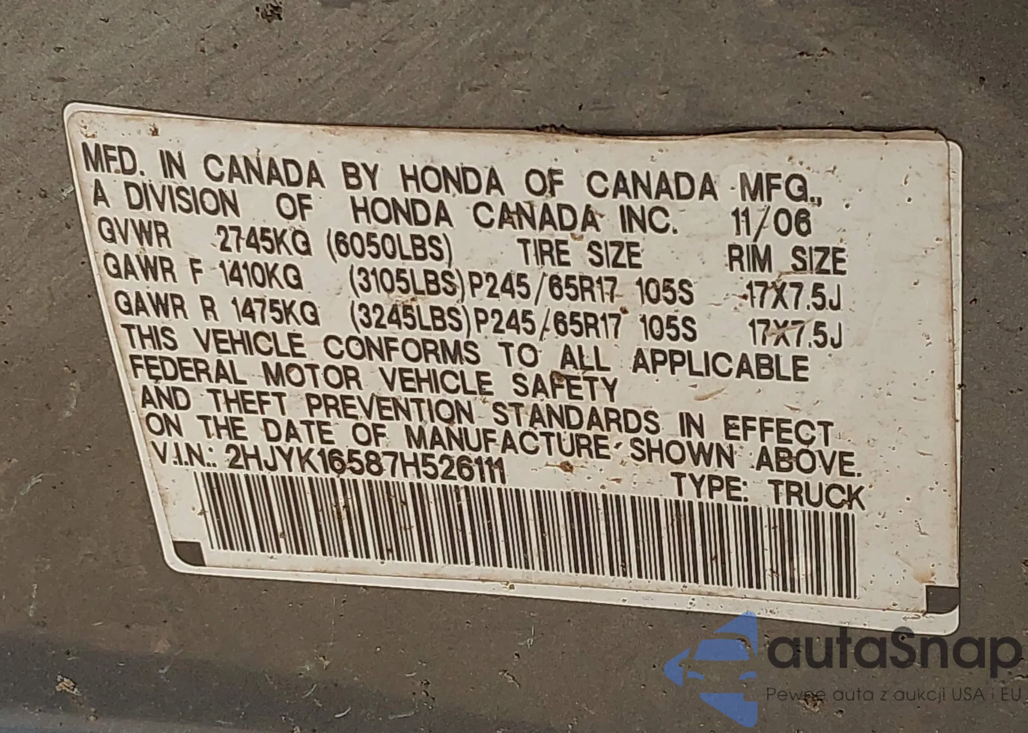 LOT: 42616443 VIN: 1J8GA69127L154818