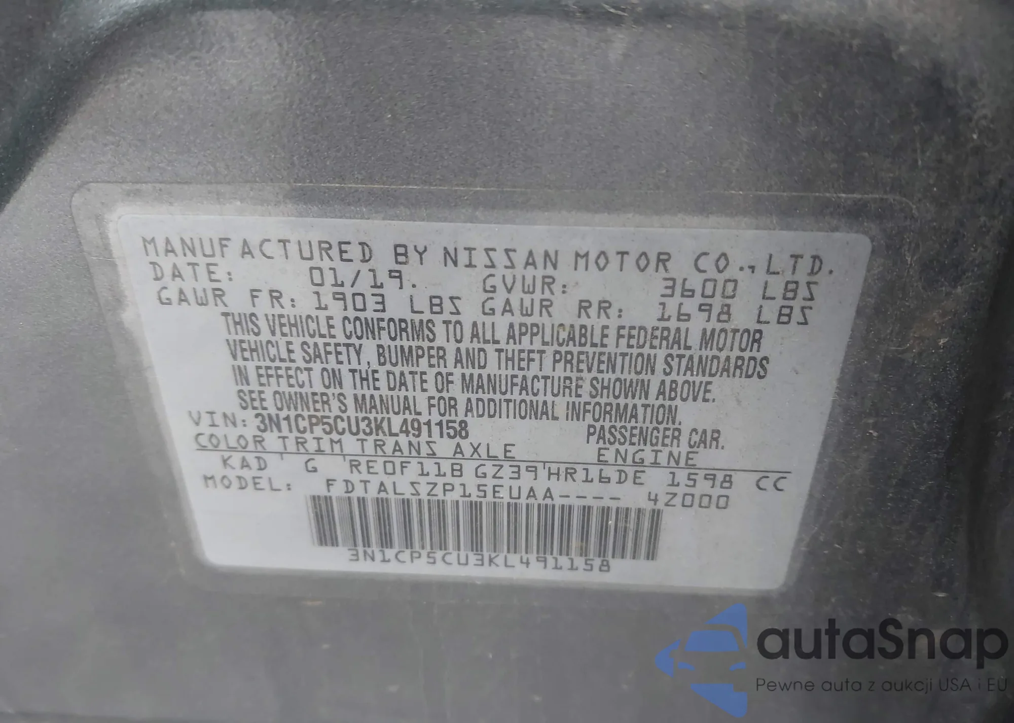 LOT: 43562935 VIN: 3N1CP5CU3KL491158