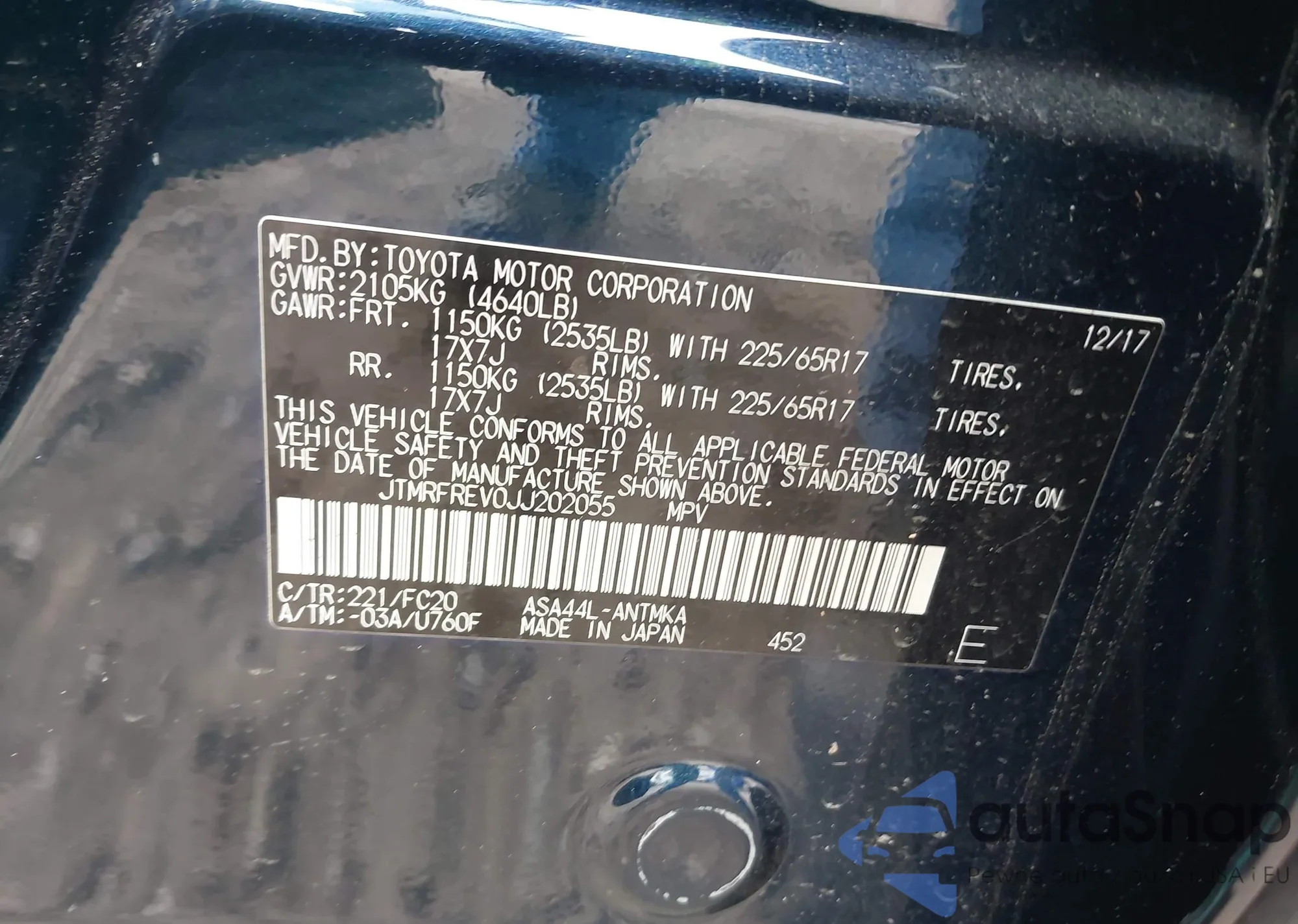 LOT: 43620846 VIN: JTMRFREV0JJ202055