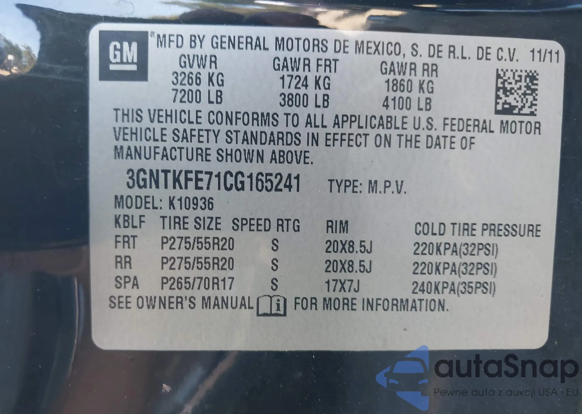 LOT: 43214384 VIN: 3GNTKFE71CG165241