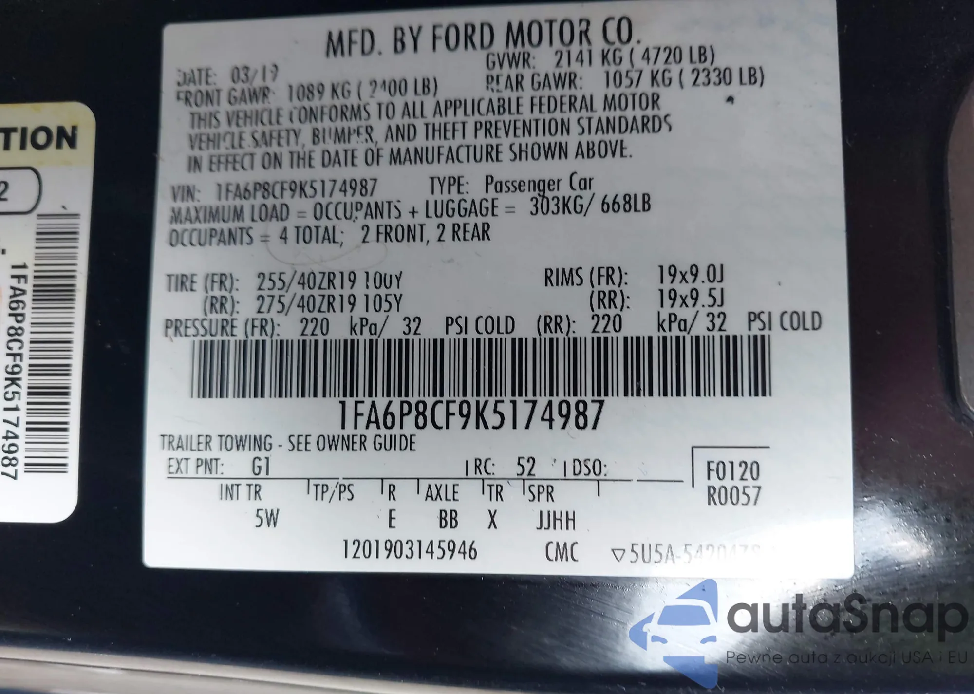 • VIN 1FA6P8CF9K5174987