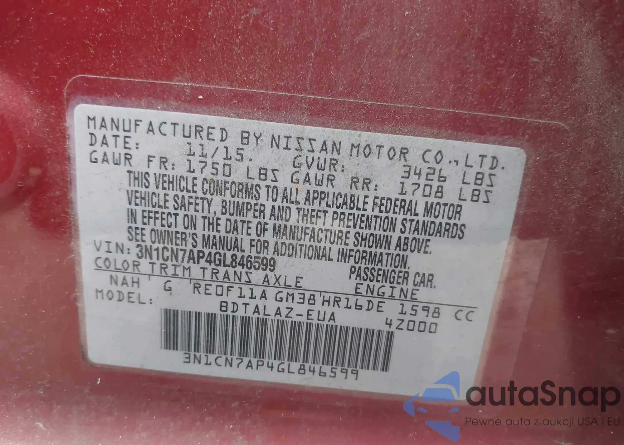 • VIN 3N1CN7AP4GL846599