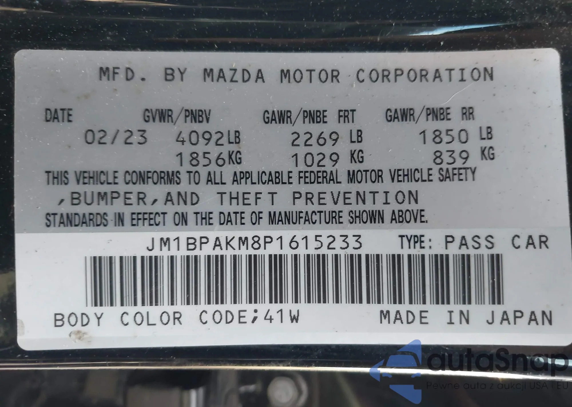 LOT: 43726682 VIN: JM1BPAKM8P1615233